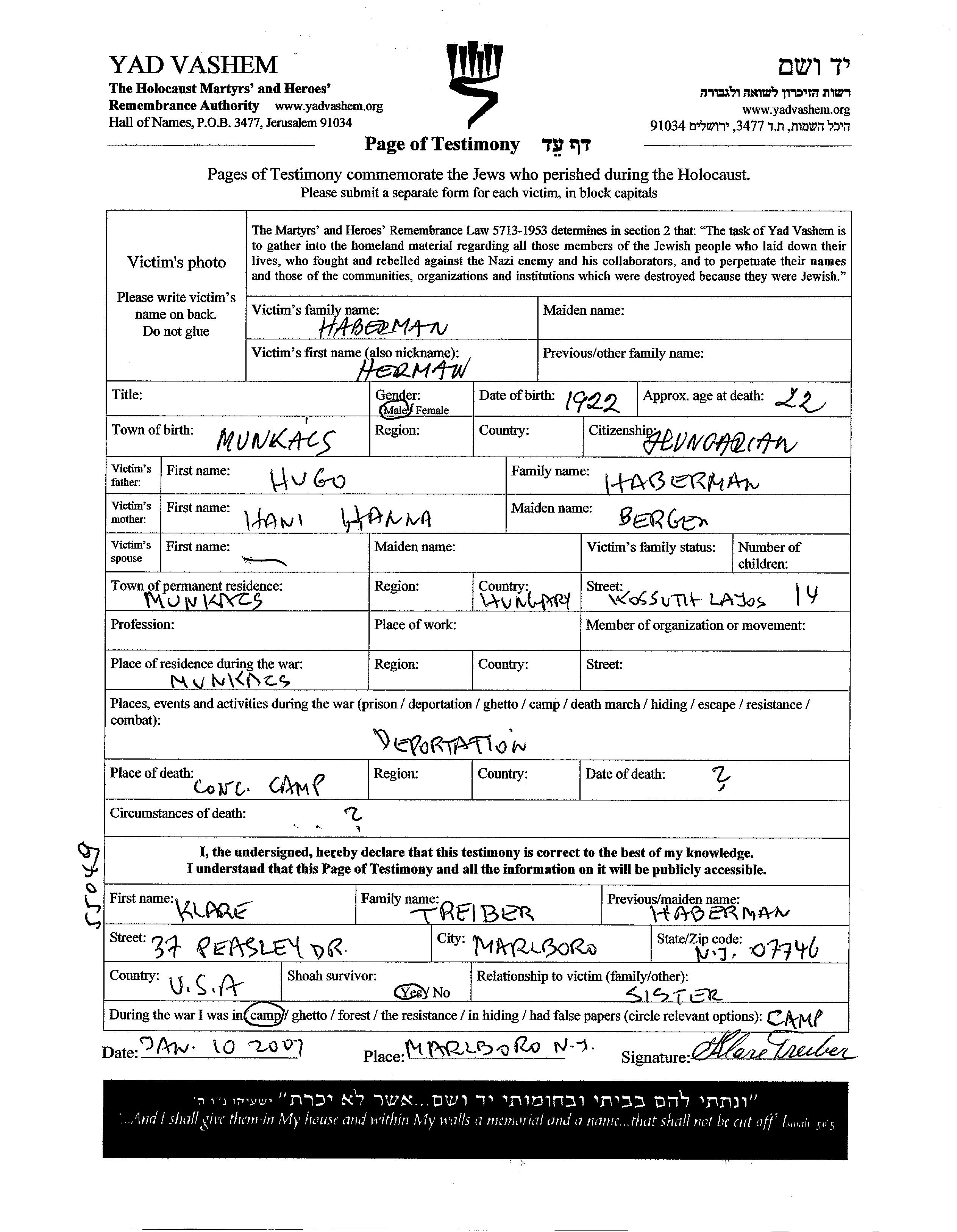 Haberman Herman 1922 Munkacs, Tchécoslovaquie Feuille de témoignage