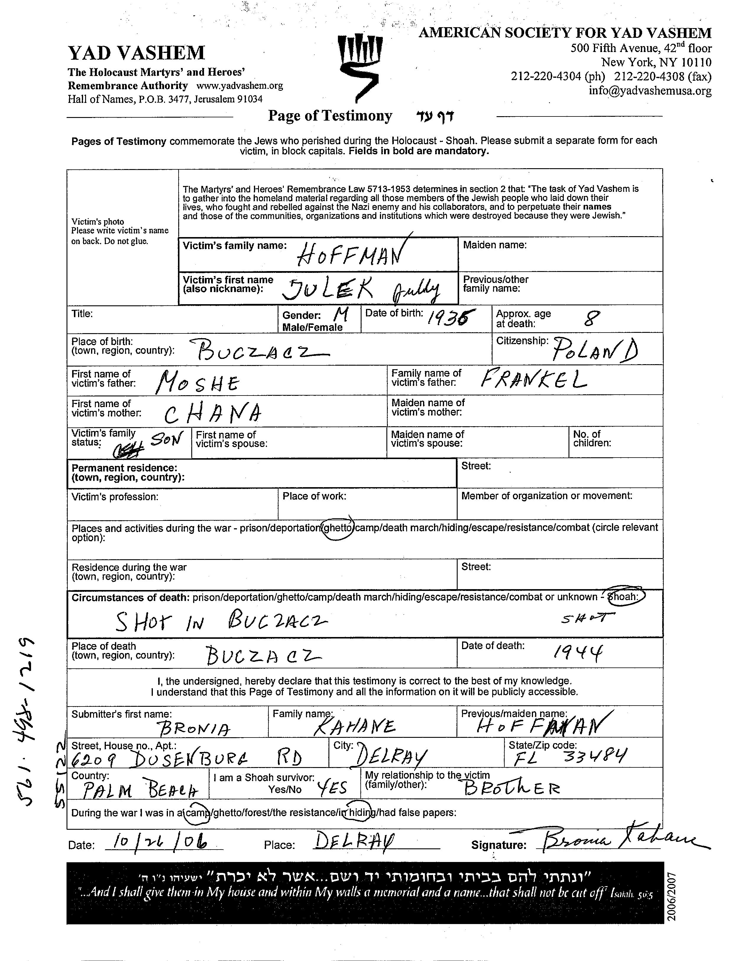 Jully Hoffman est né à Buczacz, Pologne en 1935, fils de Moshe et de Chana. Il était Enfant et Enfant. Avant la seconde guerre mondiale il vivait à Buczacz, Pologne. Au cours de la guerre, il était à Buczacz, Pologne.