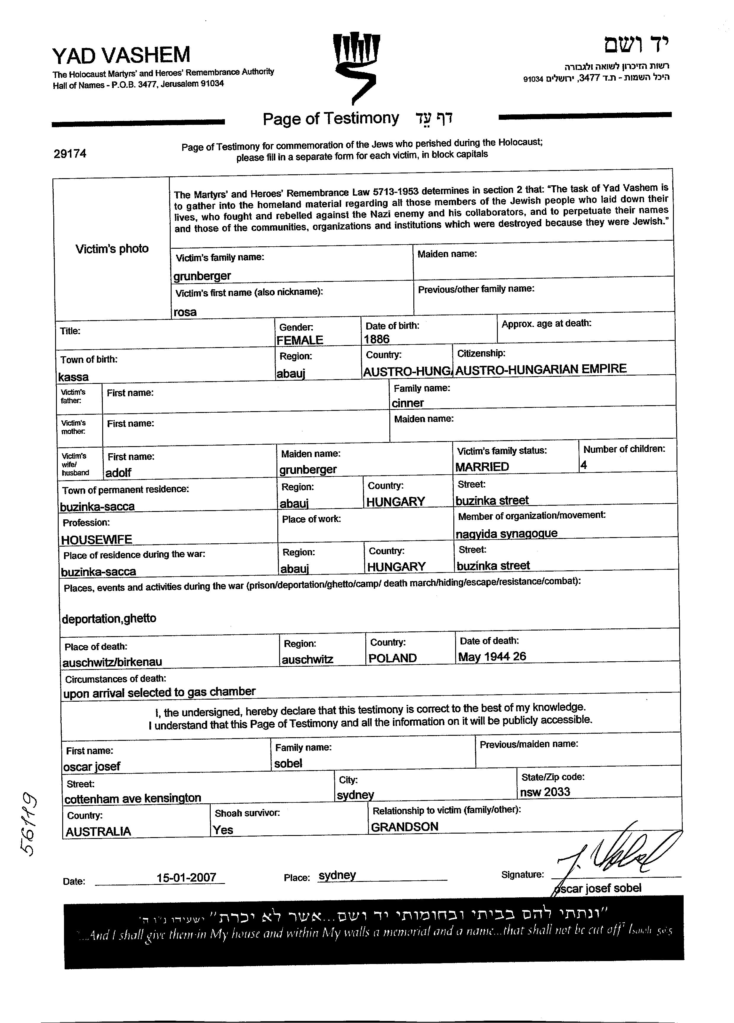 Rosa Grunberger est née à Kassa, Tchécoslovaquie en 1886. Elle était Femme au foyer et Mariée à Adolf née Grunberger. Avant la seconde guerre mondiale elle vivait à Buzinka, Tchécoslovaquie. Pendant la guerre, elle était à Buzinka, Tchécoslovaquie.