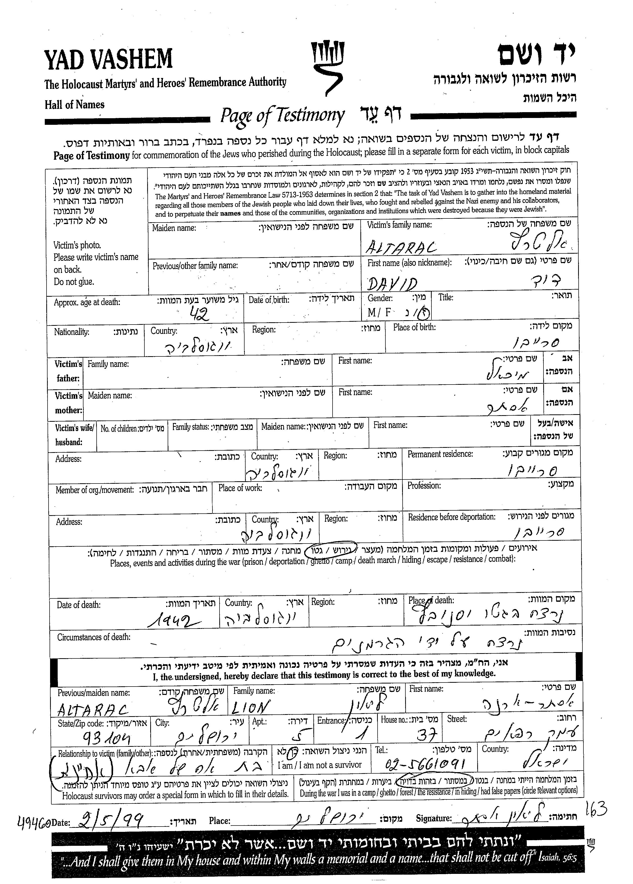 Yad Vashem - Pages of Testimony Names Memorial Collection