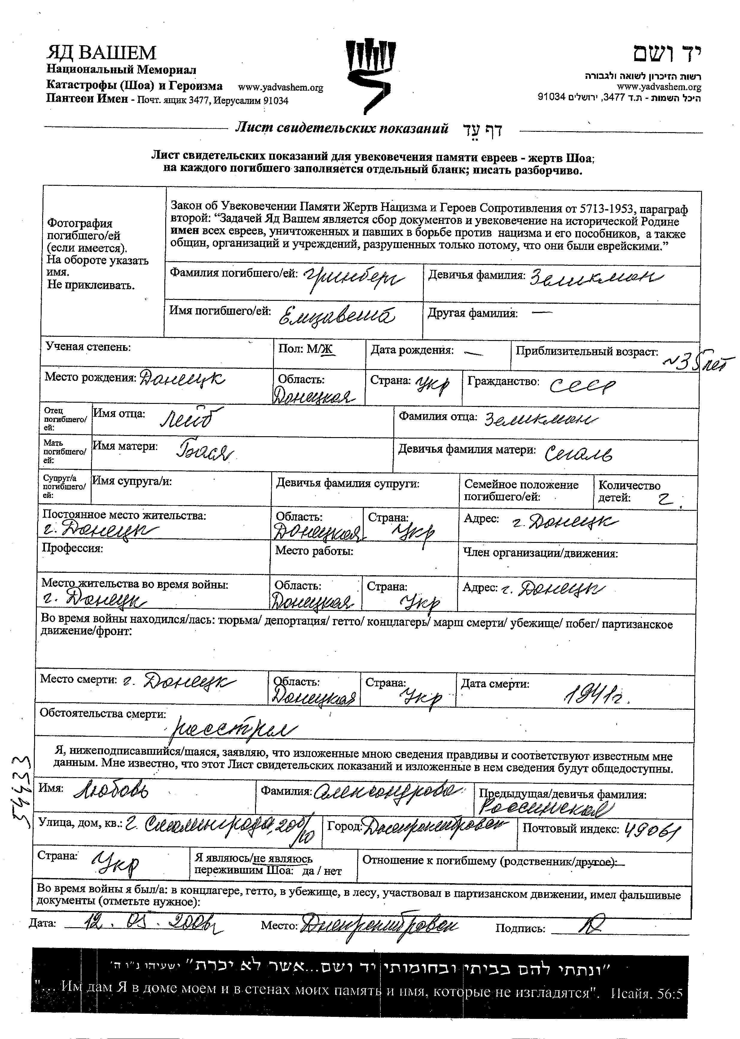 Grinberg Yelizaveta Donetsk, Ukraine (URSS) Feuille de témoignage