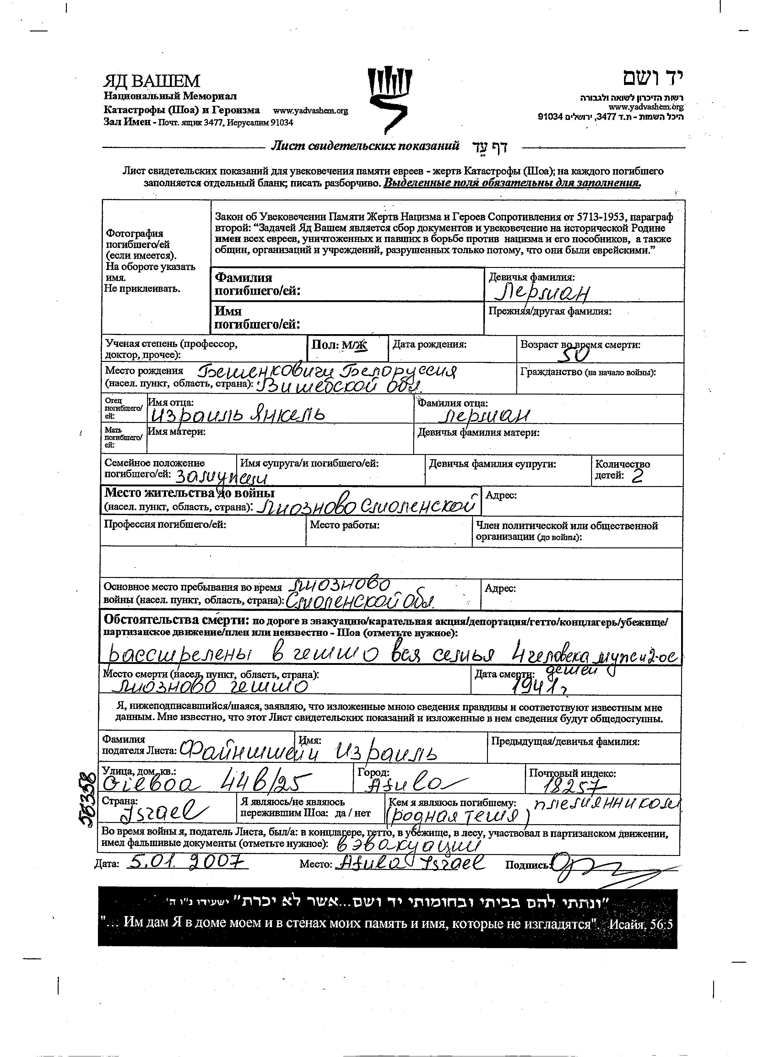 Yad Vashem - Pages of Testimony Names Memorial Collection