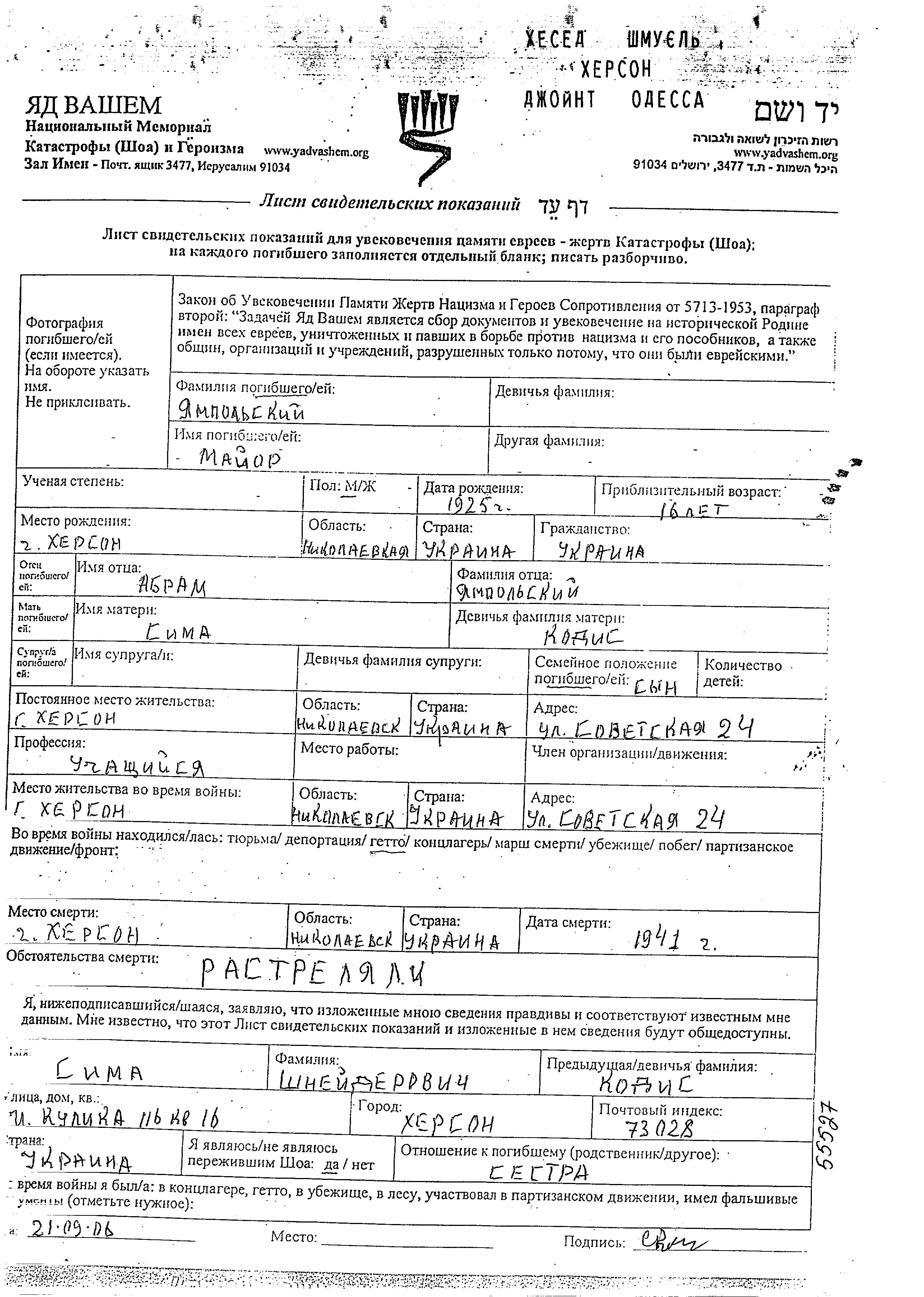Maior a été assassiné pendant la Shoah. Lieu de la mort: Kherson, Ukraine (URSS) en 1941.