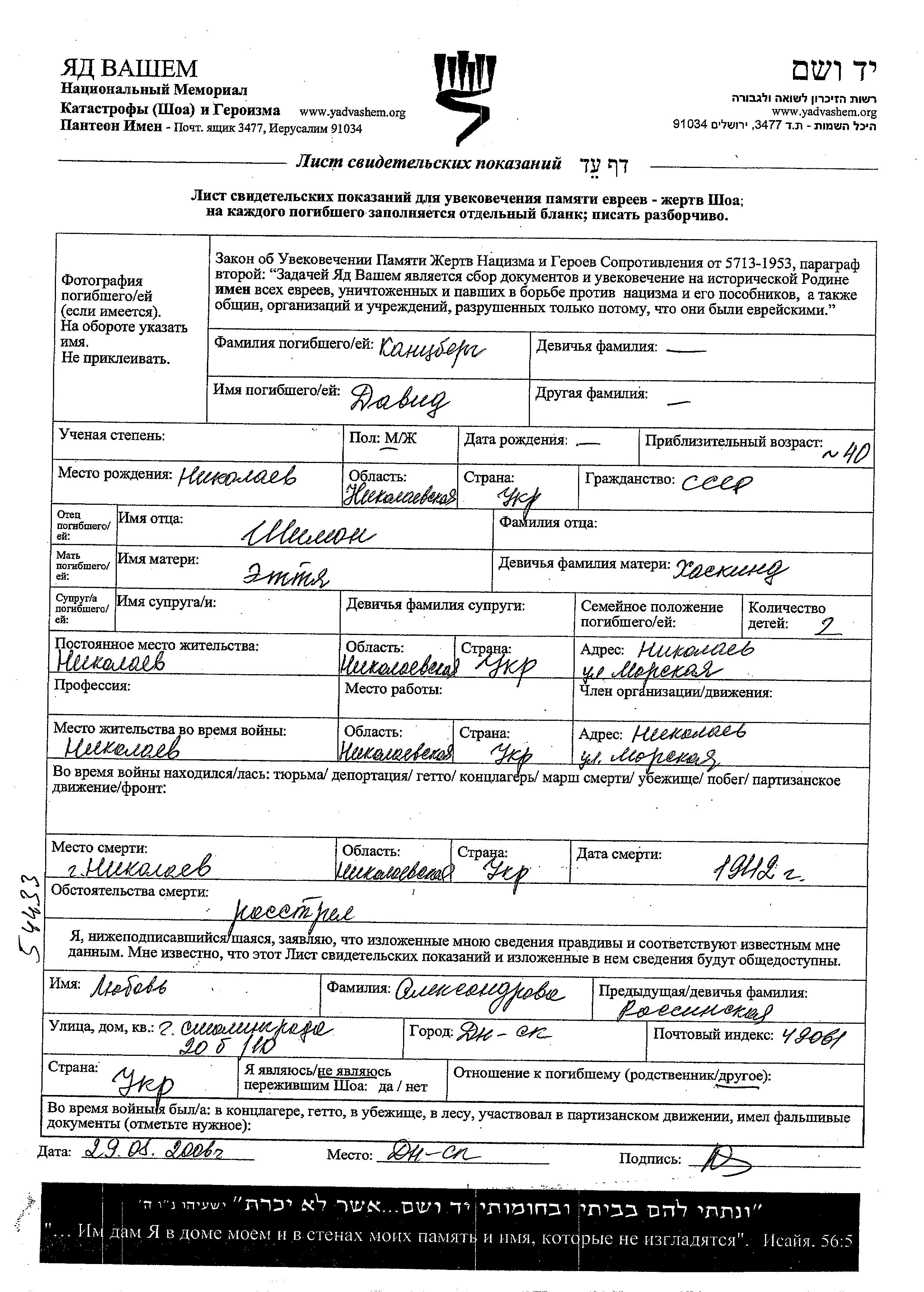 Kantzberg David Nikolaev, Ukraine (URSS) Feuille de témoignage