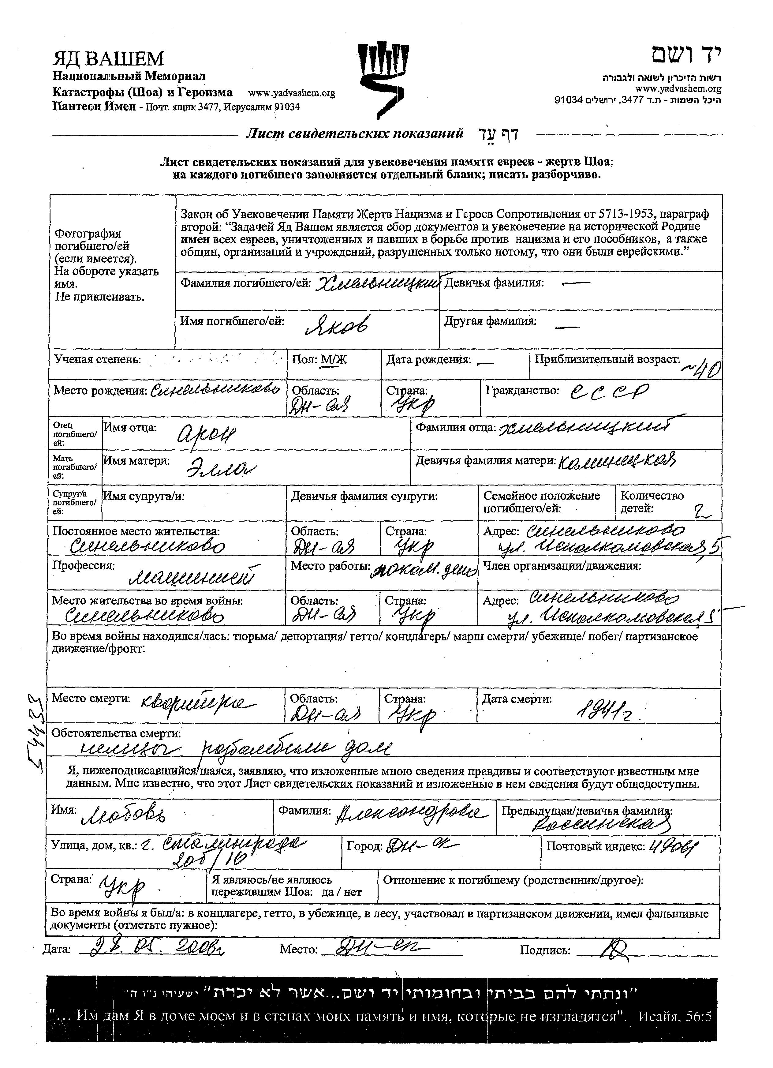 Au cours de la Shoah, les Juifs ont été assassinés de diverses façons : gazage, exécution par balle, immolation, noyade, enterrés vivants, épuisement par les travaux forcés, affamement, maladies et épidémies, privation de soins médicaux et de mesures de salubrité, etc. Certains Juifs ont mis fin à leur vie pour échapper à l'arrestation, aux persécutions ou aux souffrances permanentes et sans aucun espoir. Des dizaines de milliers de soldats juifs servant dans l’armée soviétique et capturés comme prisonniers de guerre furent sélectionnés comme juifs et assassinés. Beaucoup furent enregistrés comme «disparus au combat».