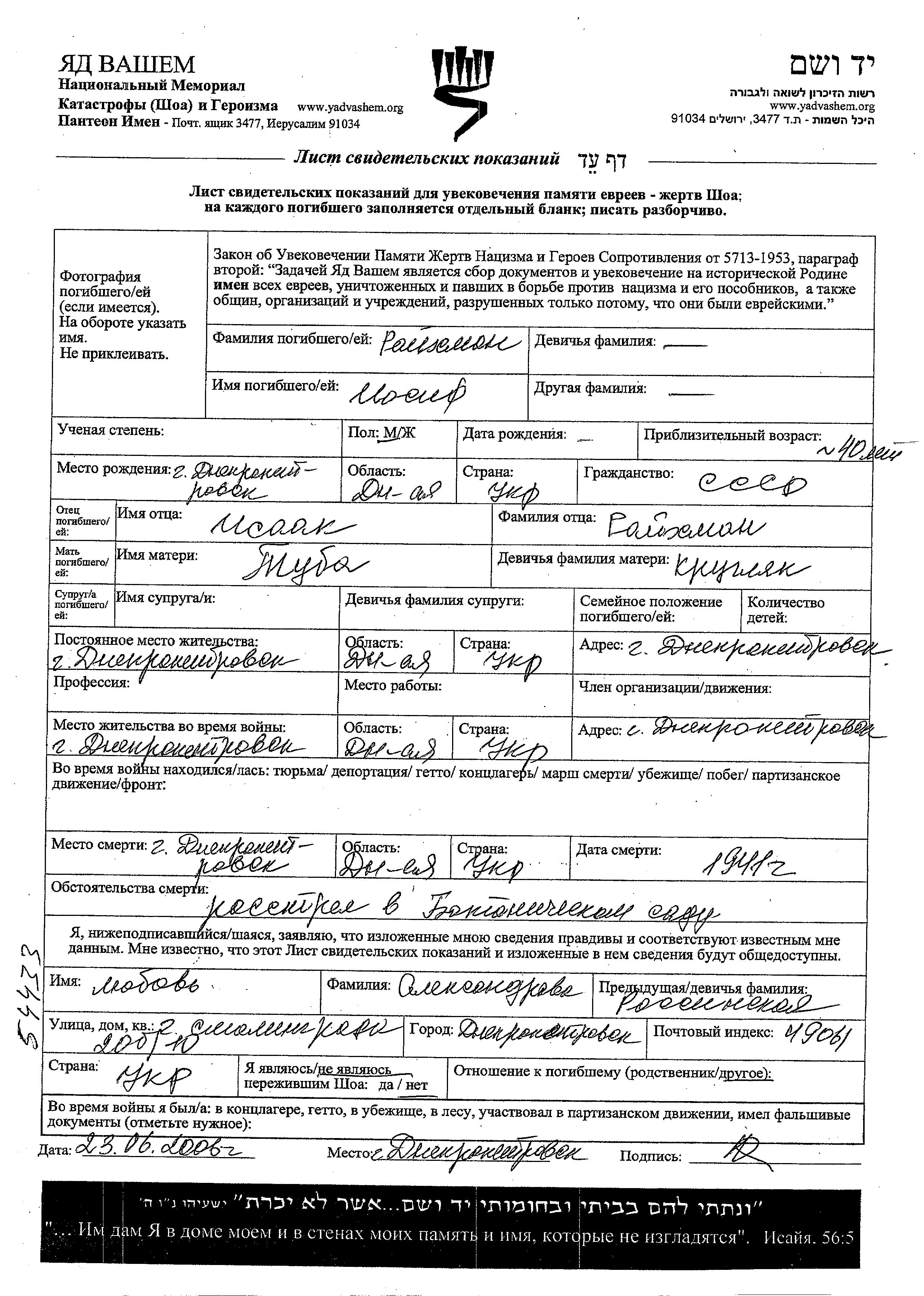 Raikhman Iosif Dnepropetrovsk, Ukraine (URSS) Feuille de témoignage
