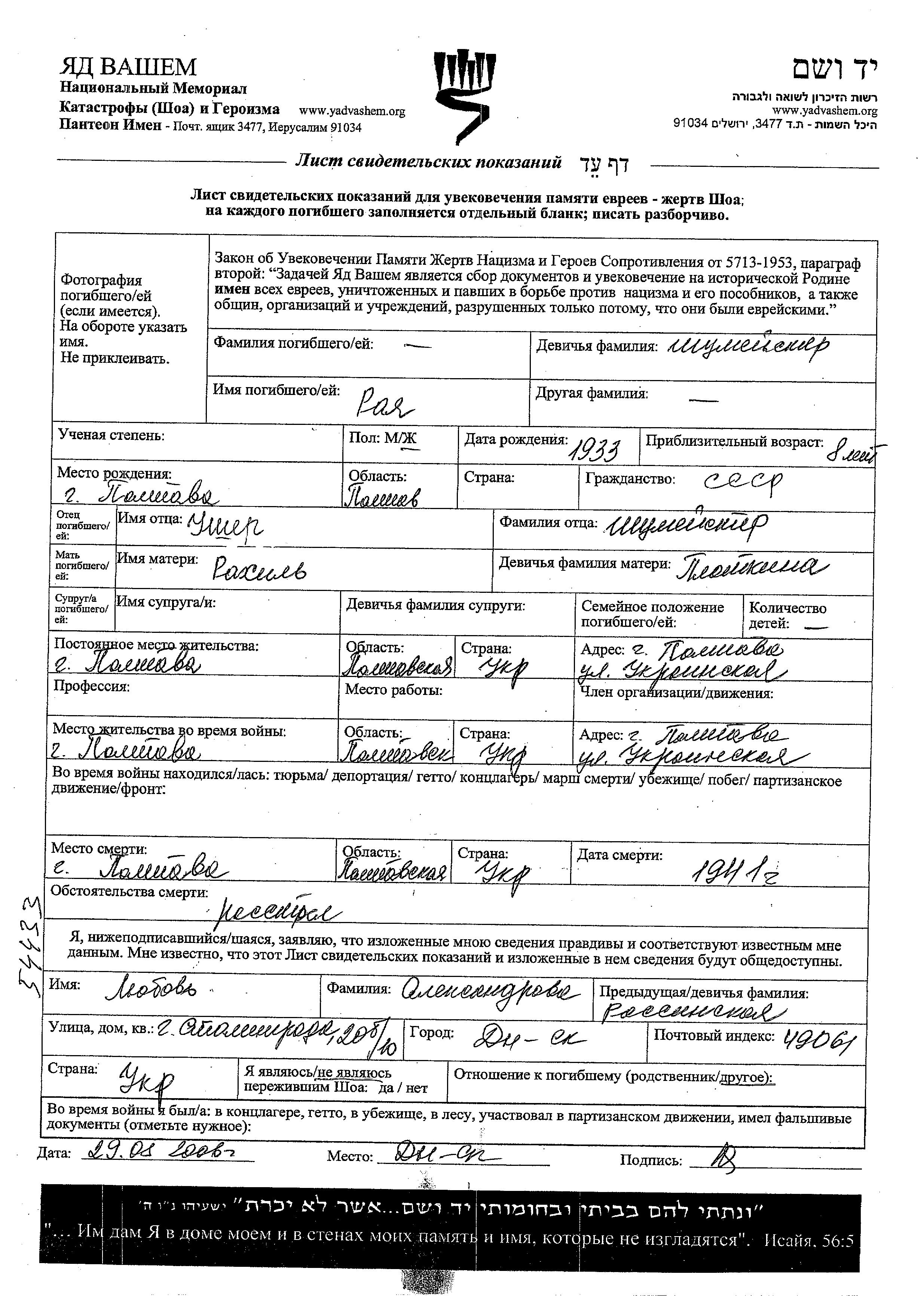 Shumeister Raya 1933 Poltava, Ukraine (URSS) Feuille de témoignage