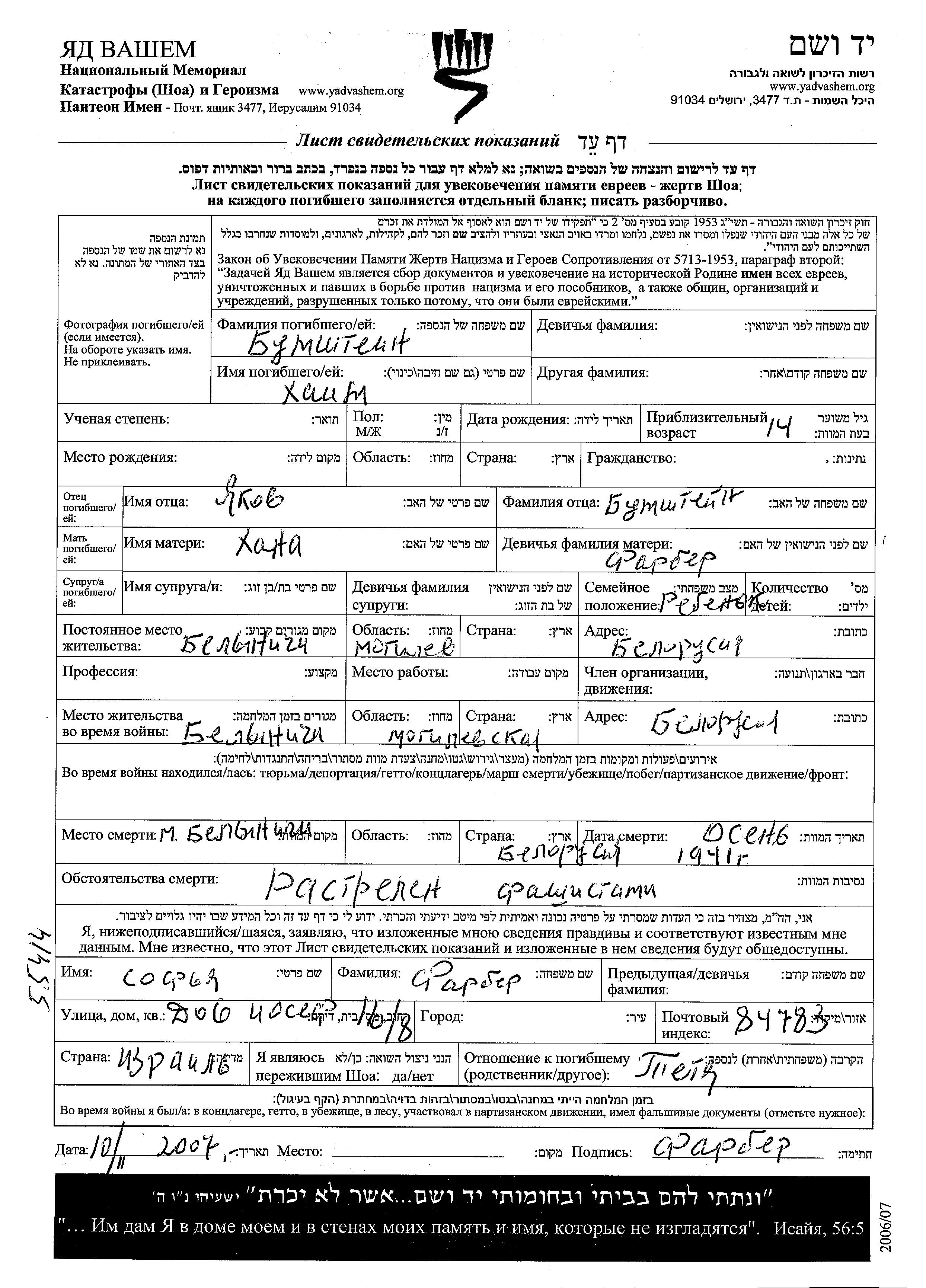 Bumshtein Khaim Belynichi, Bélorussie (URSS) Feuille de témoignage