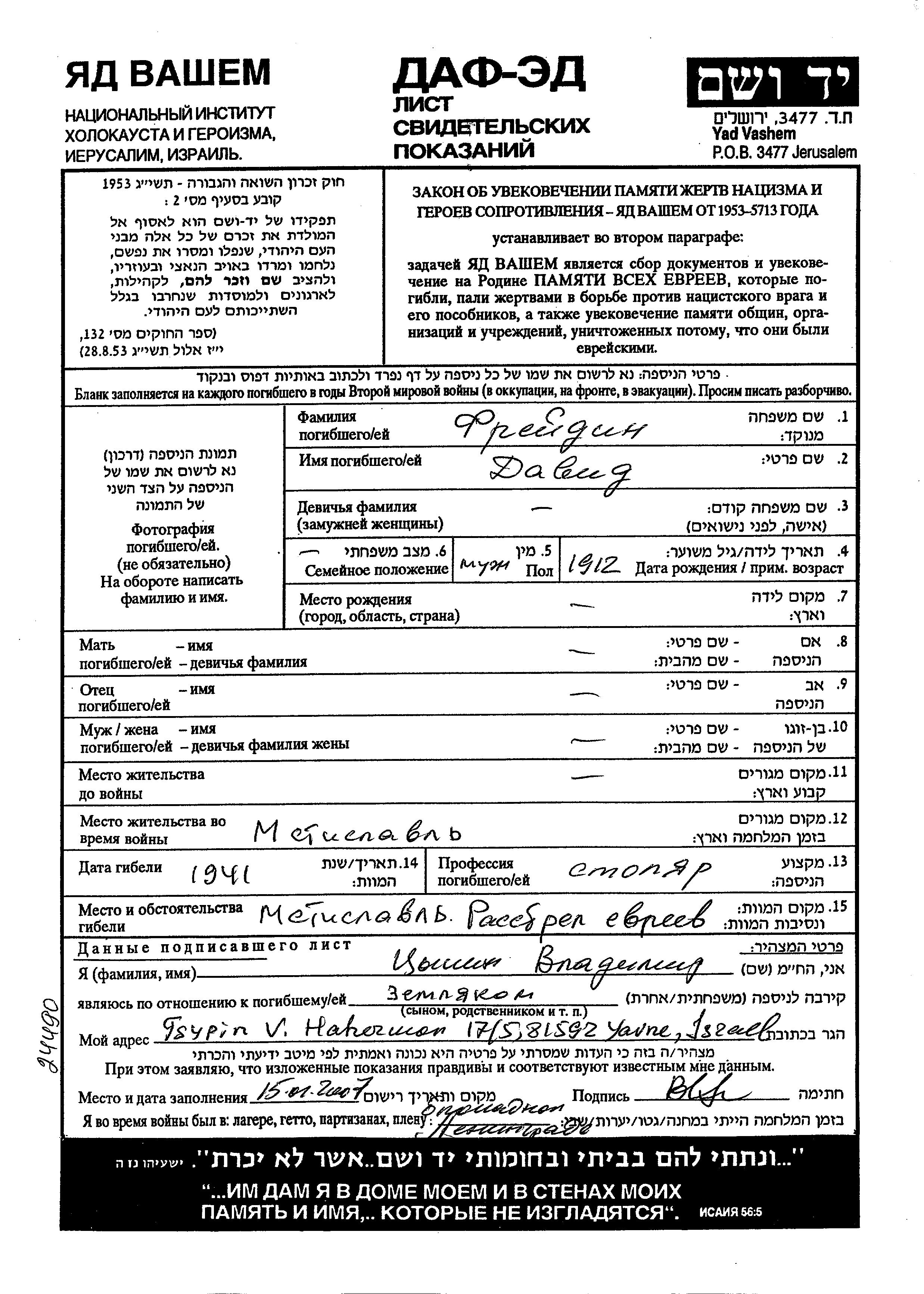 Freidin David 1912 Mstislavl, Bélorussie (URSS) Feuille de témoignage