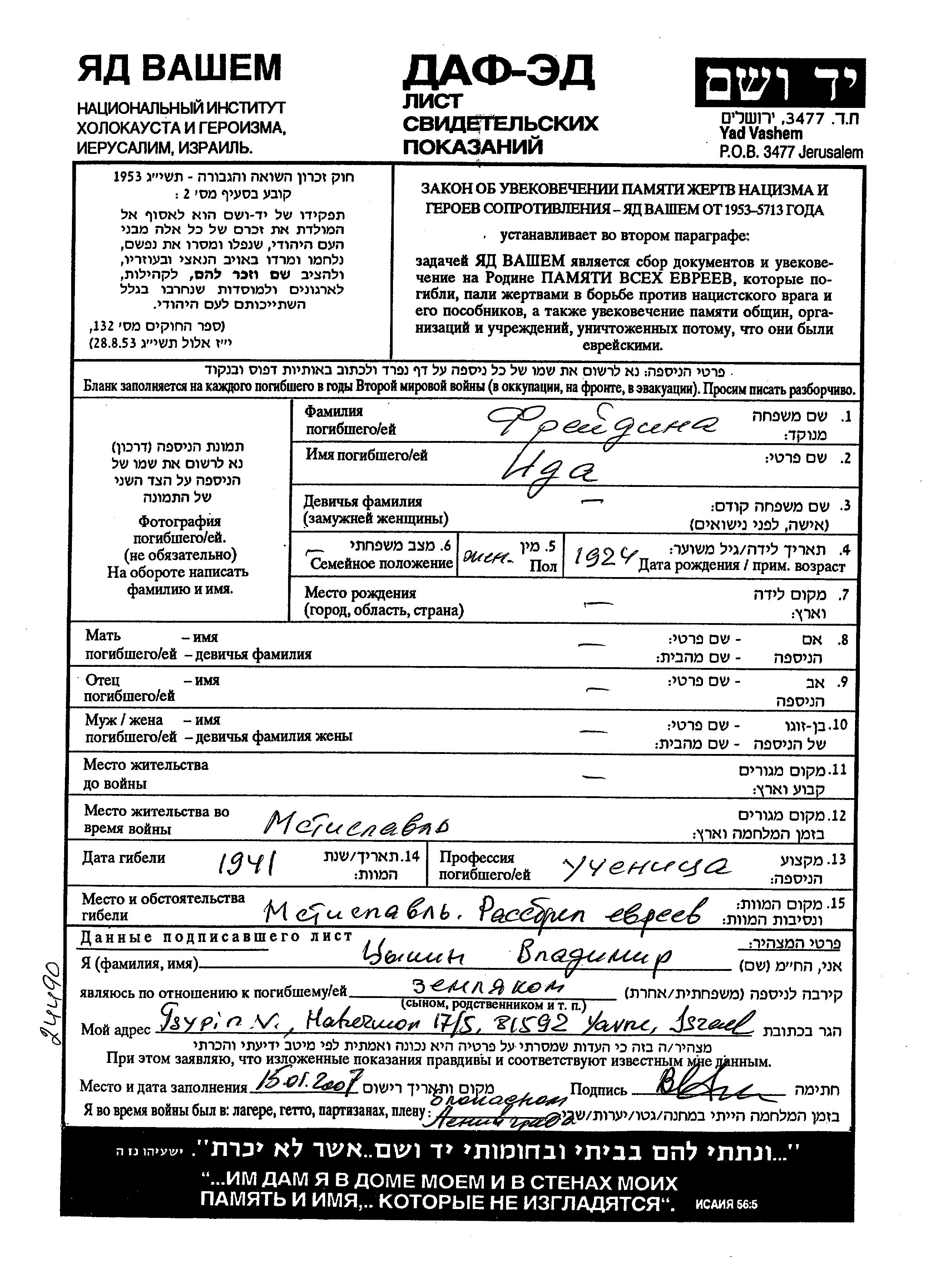 Freidina Ida 1924 Mstislavl, Bélorussie (URSS) Feuille de témoignage