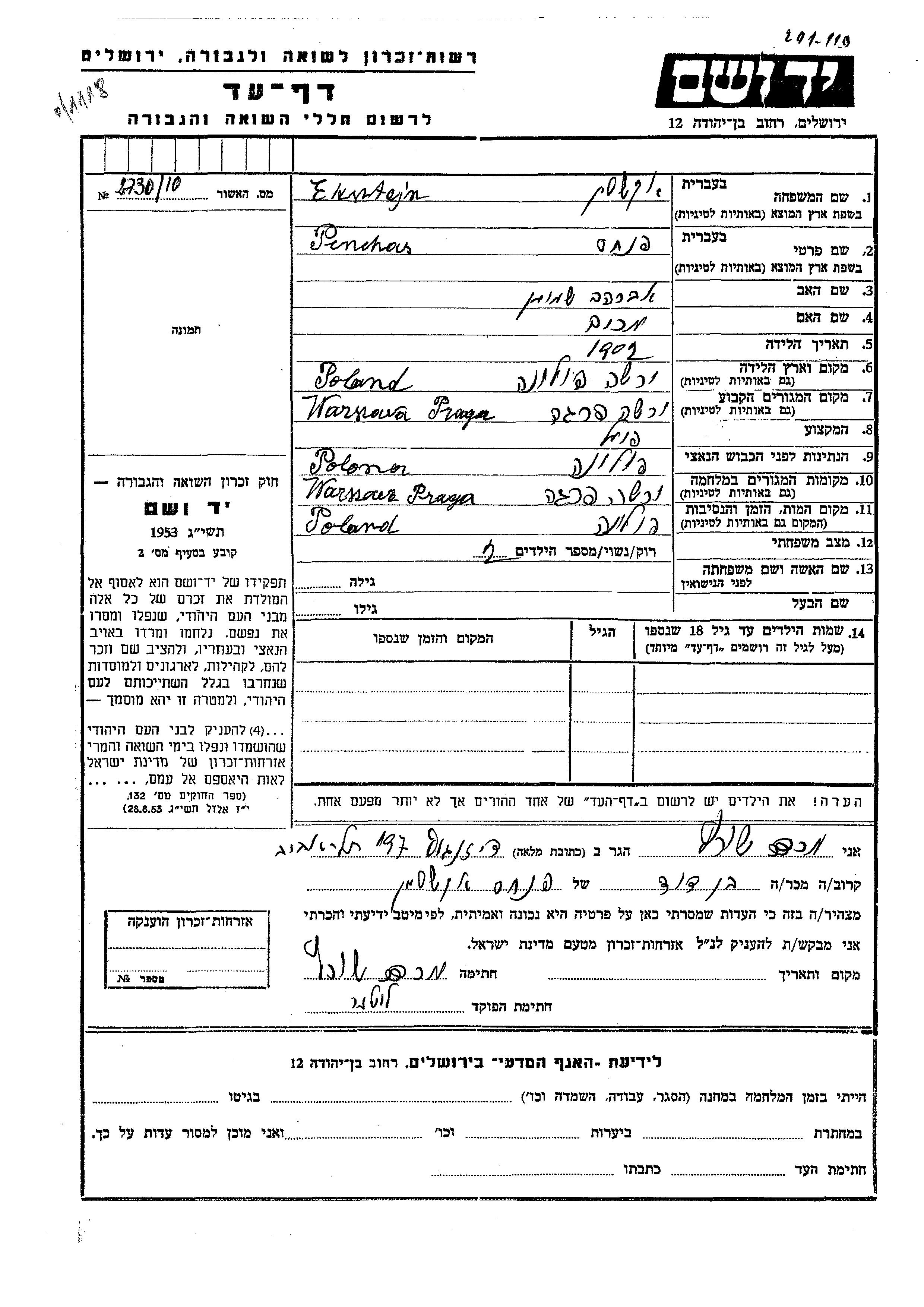 Eksztajn Pinchas 1902 Praga Warszawa, Pologne Feuille de témoignage