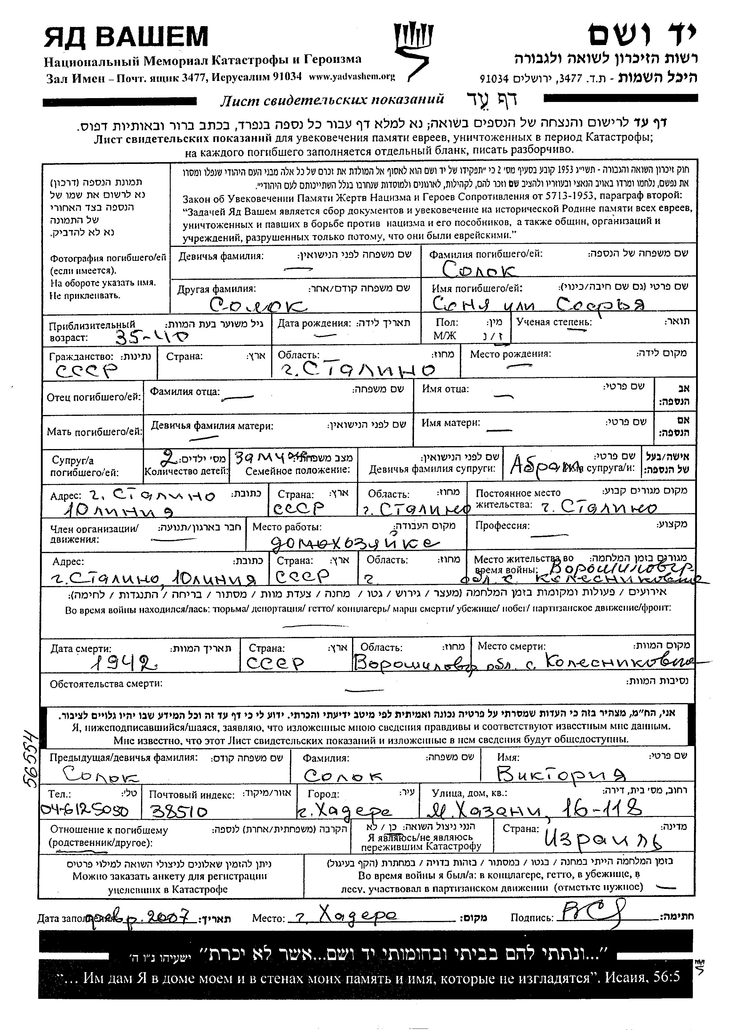 Sonya Solok est née à Stalino, Ukraine (URSS). Elle était Femme au foyer et Mariée à Abram. Avant la seconde guerre mondiale elle vivait à Stalino, Ukraine (URSS). Pendant la guerre, elle était à Kolesnikovka, Ukraine (URSS).