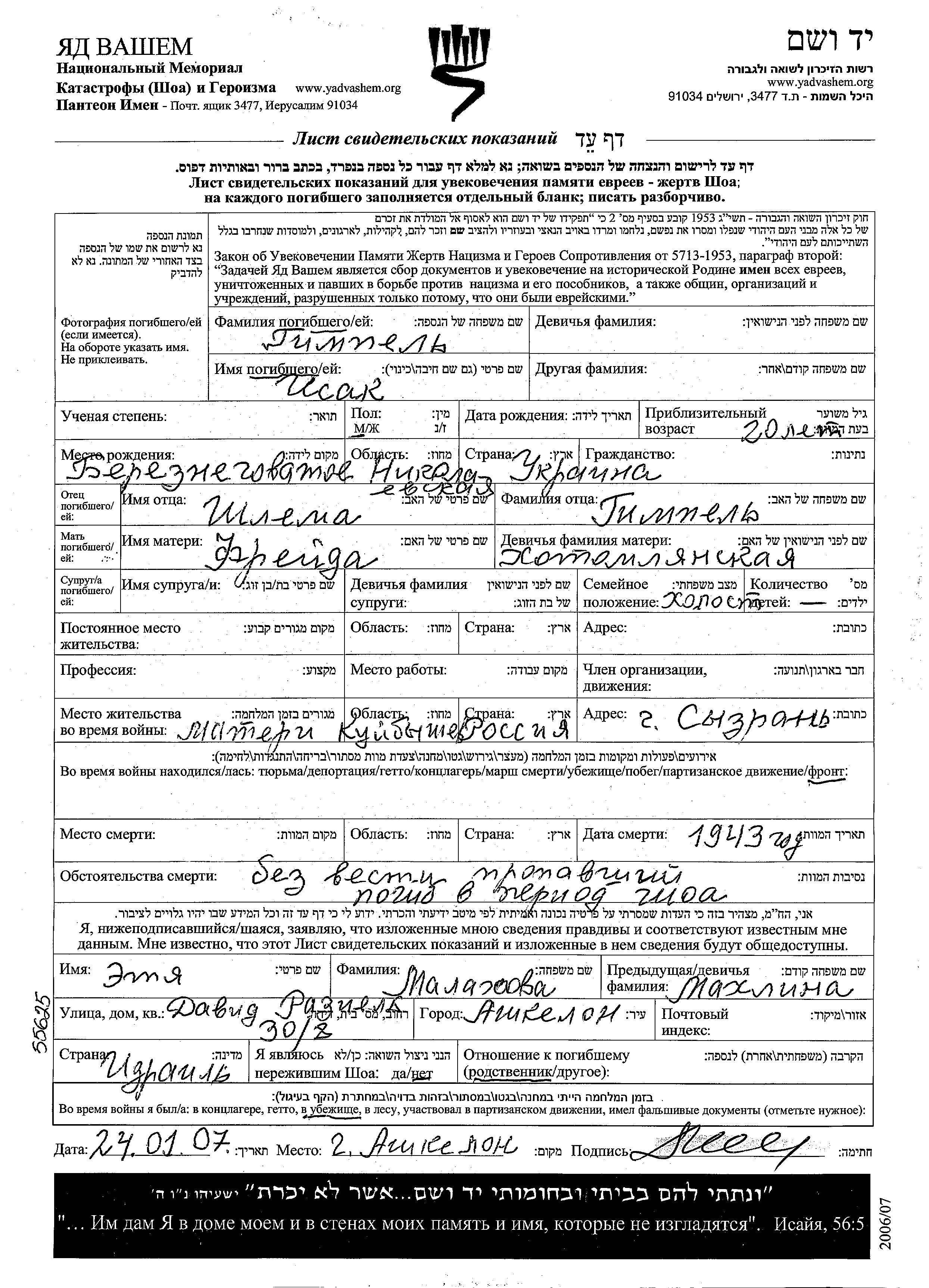 Yad Vashem - Pages of Testimony Names Memorial Collection