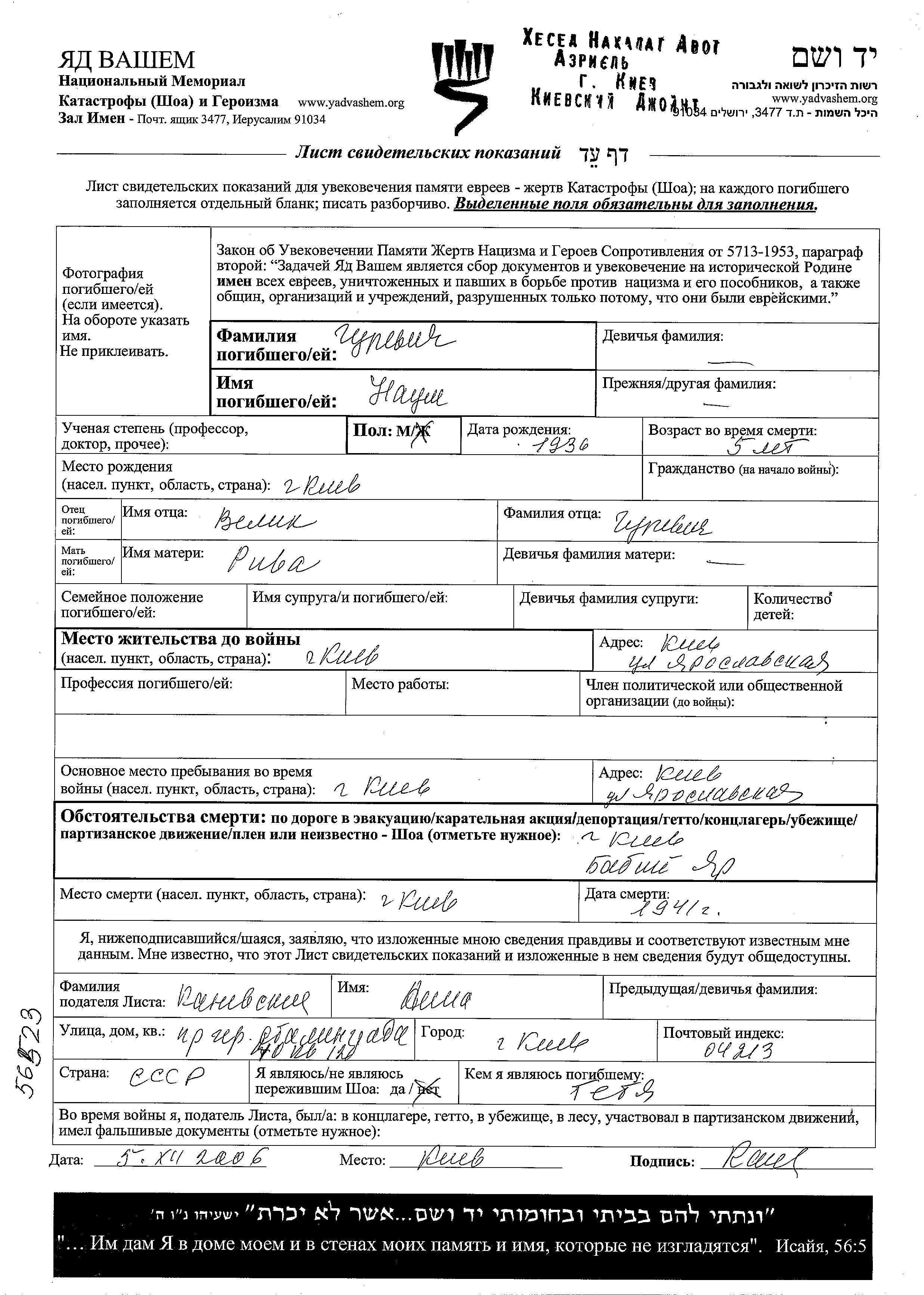 Gurevich Naum 1936 Kiev, Ukraine (URSS) Feuille de témoignage