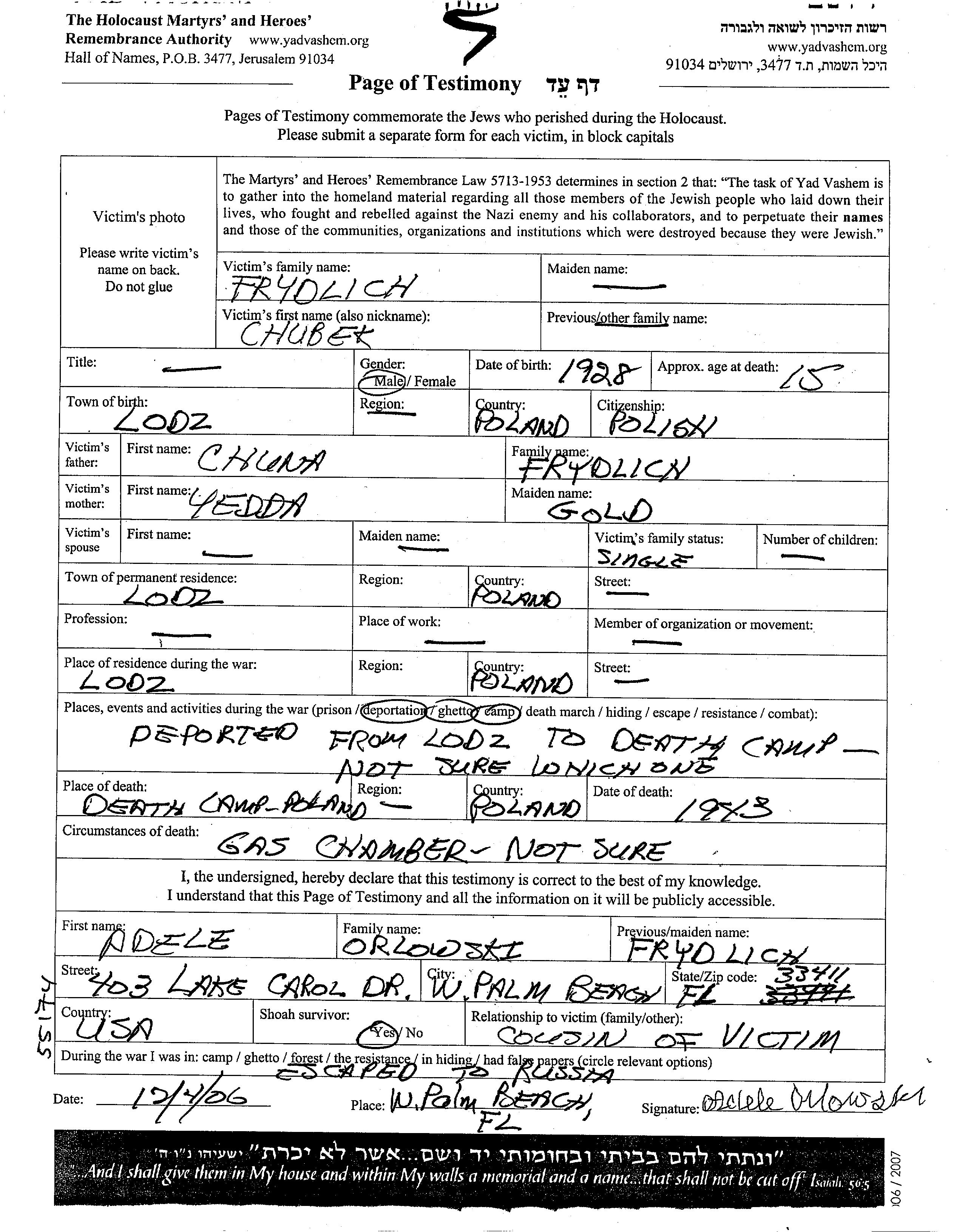 Chubek Frydlich est né à Lodz, Pologne en 1928, fils de Chuna et de Yedda née Gold. Il était Adolescent. Avant la seconde guerre mondiale il vivait à Lodz, Pologne. Au cours de la guerre, il était à Lodz, Pologne.