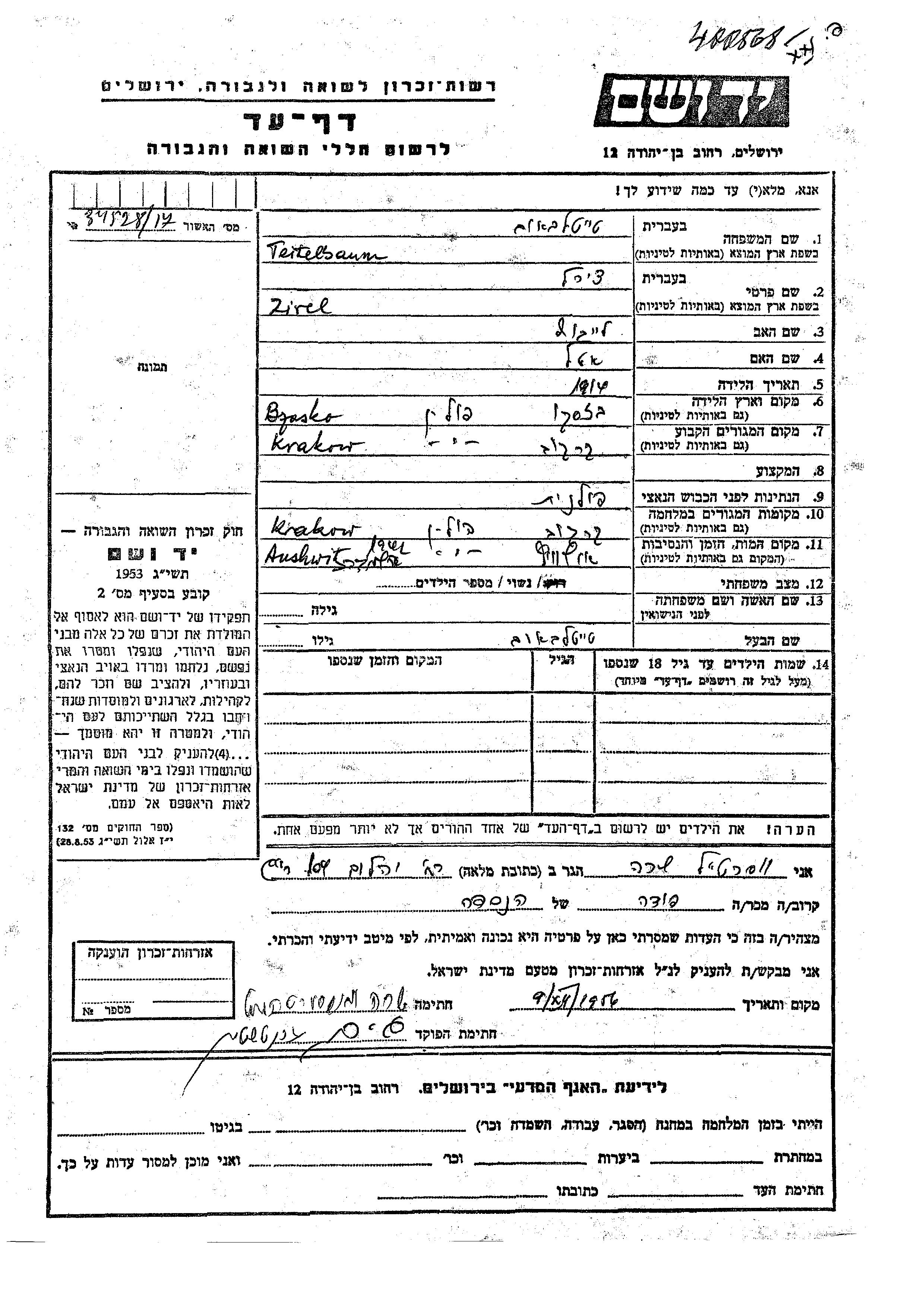 Zirel Teitelbaum est née à Brzesko, Pologne en 1914, fille de Leibush et de Etel. Elle était Célibataire. Avant la seconde guerre mondiale elle vivait à Krakow, Pologne. Pendant la guerre, elle était à Krakow, Pologne.