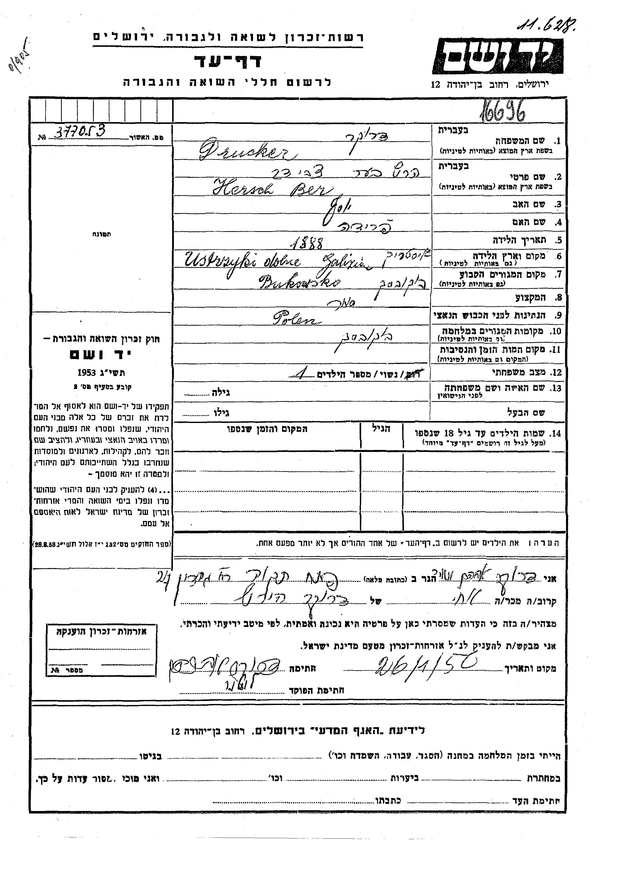 Drucker Hersh Tzvi 1888 Bukowsko, Pologne Feuille de témoignage