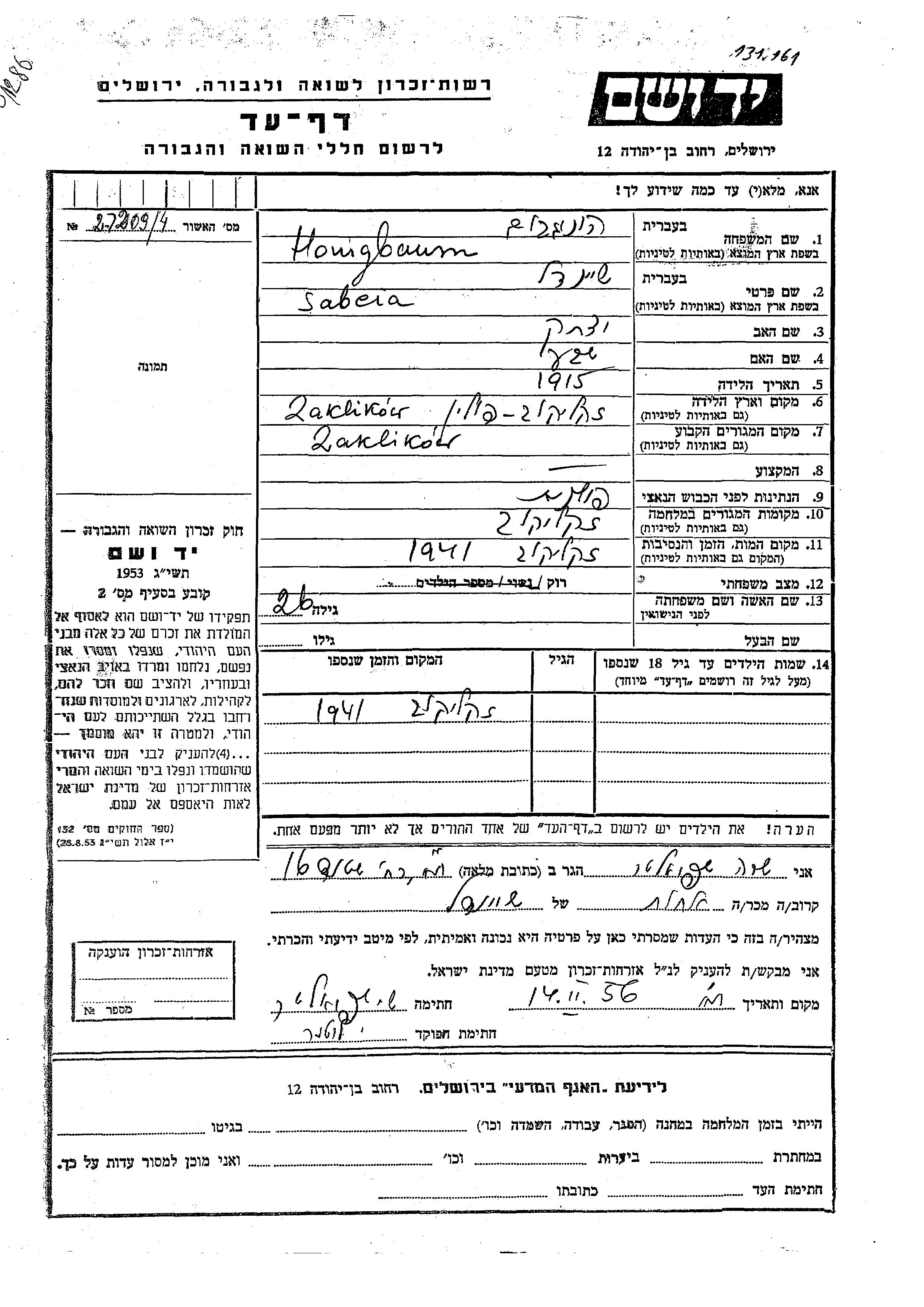 Honigbaum Sabcia Sheindl 1915 Zaklikow, Pologne Feuille de témoignage