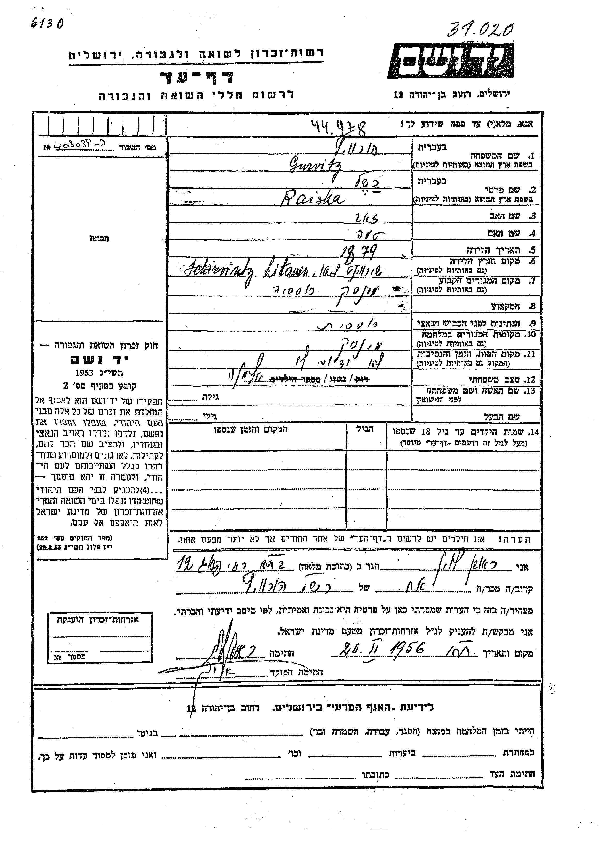 Gurvitz Horovitz Raisha 1879 Minsk, Bélorussie (URSS) Feuille de témoignage