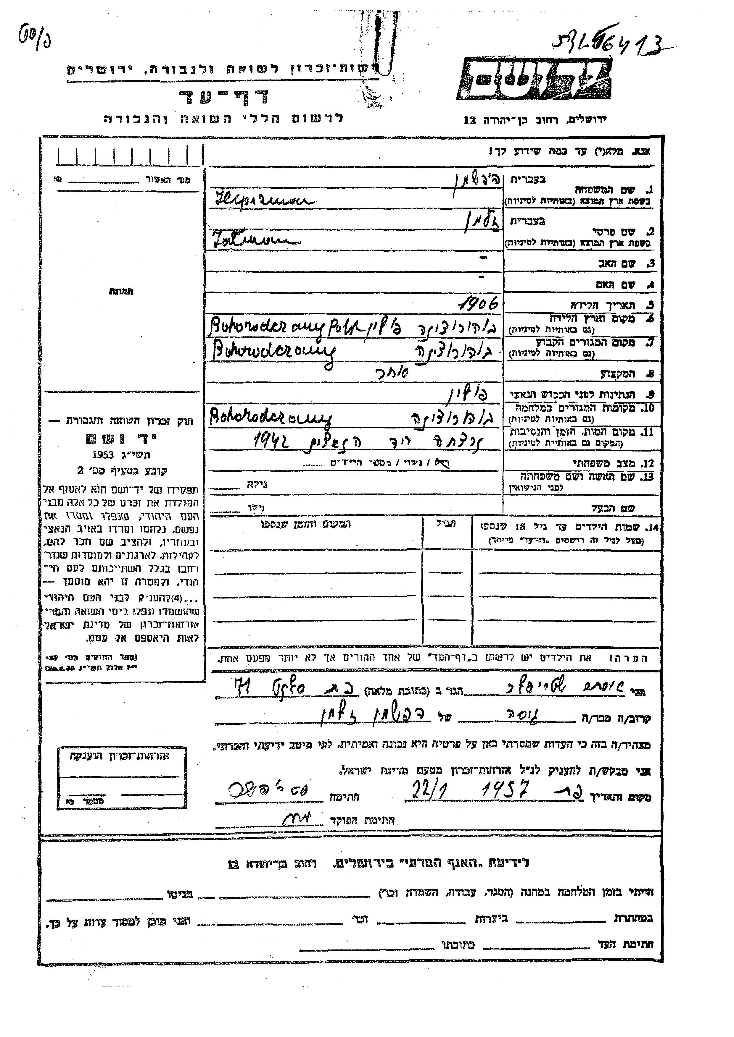 Hipszman Zalman 1906 Bohorodczany, Pologne Feuille de témoignage