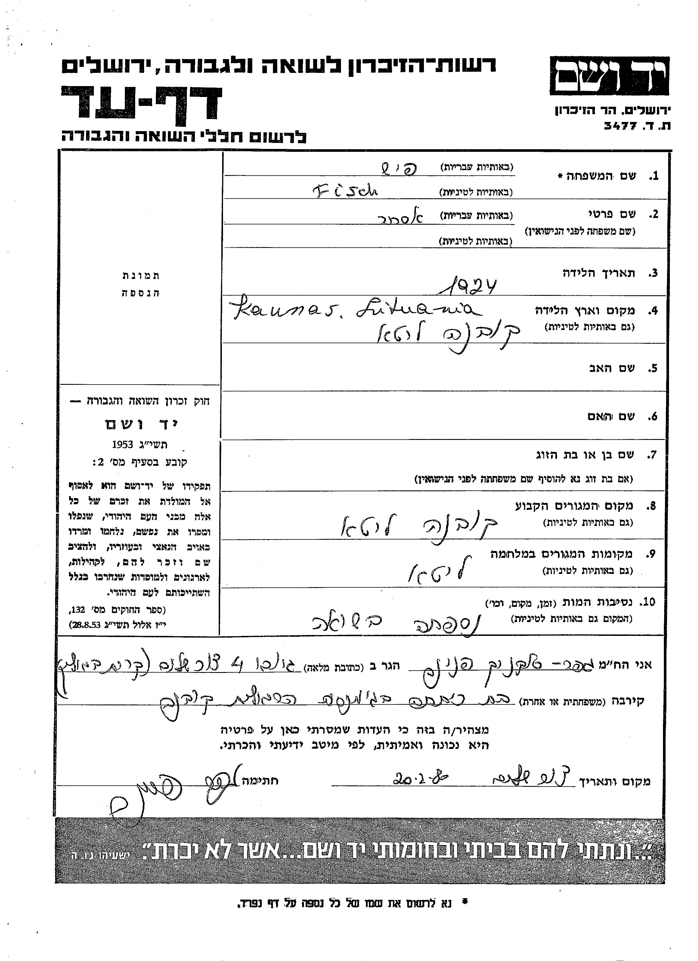 Fisch Ester 1924 Kowno, Lituanie Feuille de témoignage