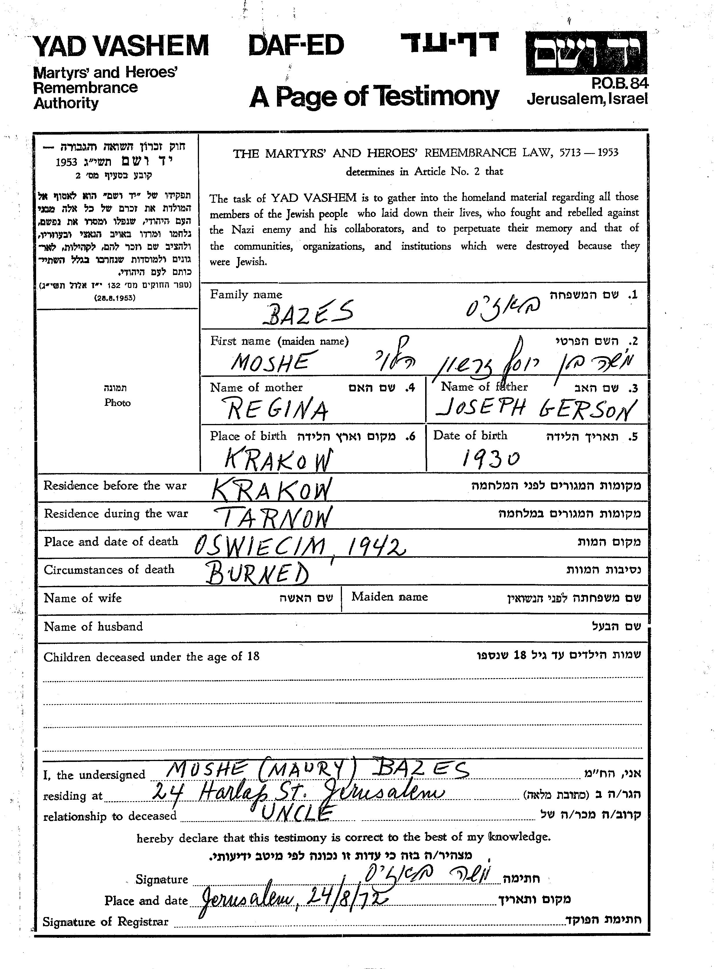 Bazes Moshe 1930 Krakow, Pologne Feuille de témoignage