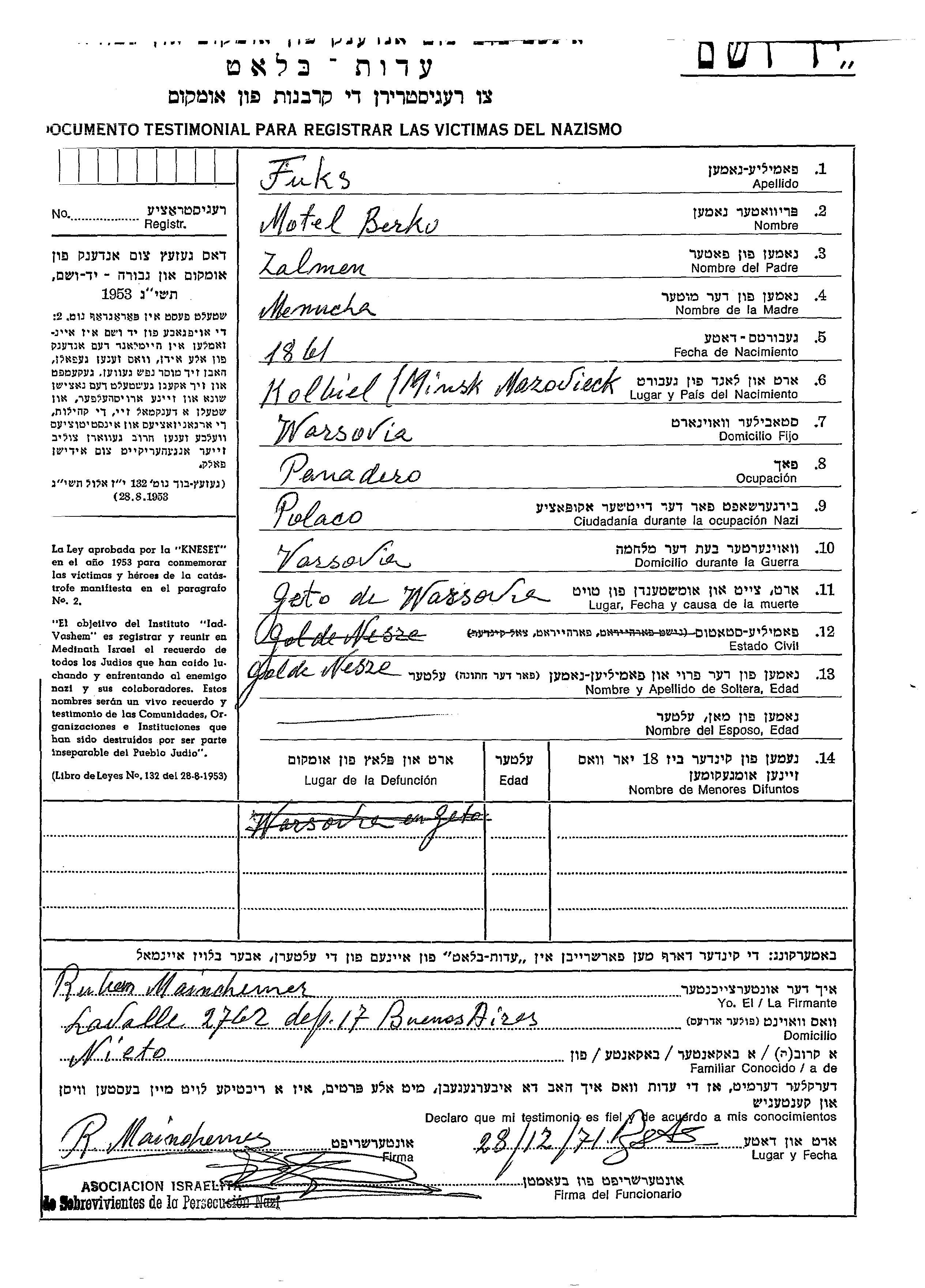 Motel Berko Fuks est né à Minsk Mazowiecki, Pologne en 1861, fils de Zalman et de Menuche. Il était Panadero et Mariée à Golda Nesze. Avant la seconde guerre mondiale il vivait à Warsaw, Pologne. Au cours de la guerre, il était à Warsaw, Pologne.