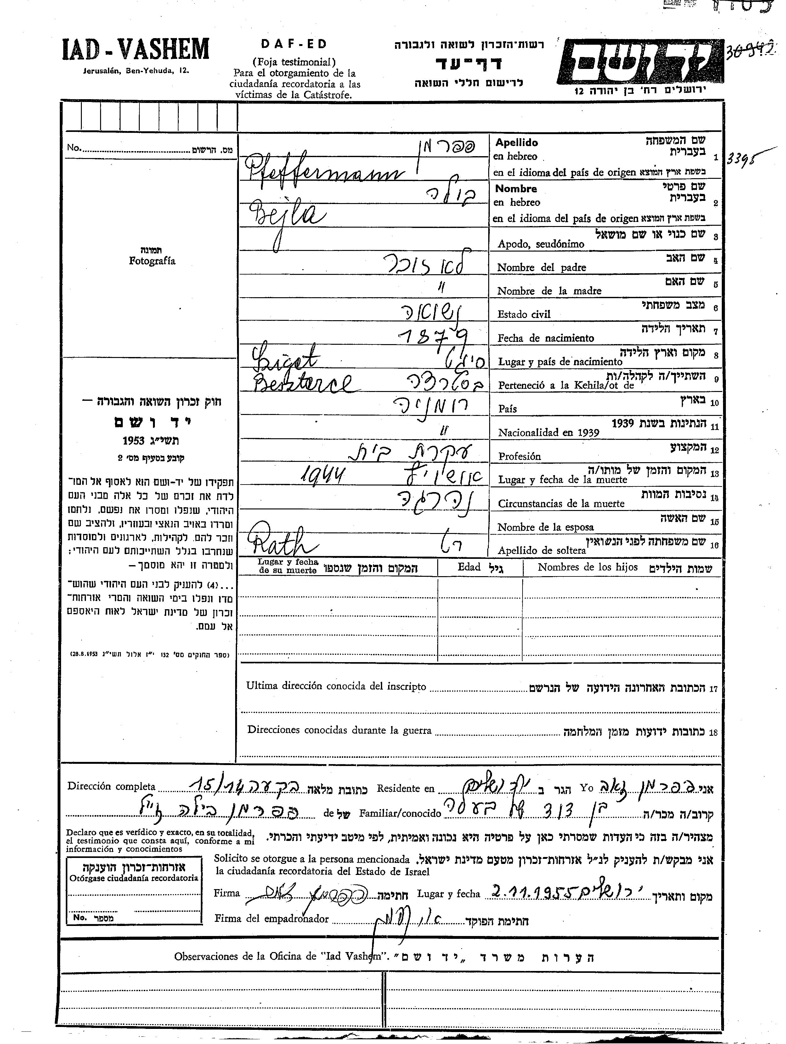 Pfeffermann Bejla 1879 Besztece, Roumanie Feuille de témoignage