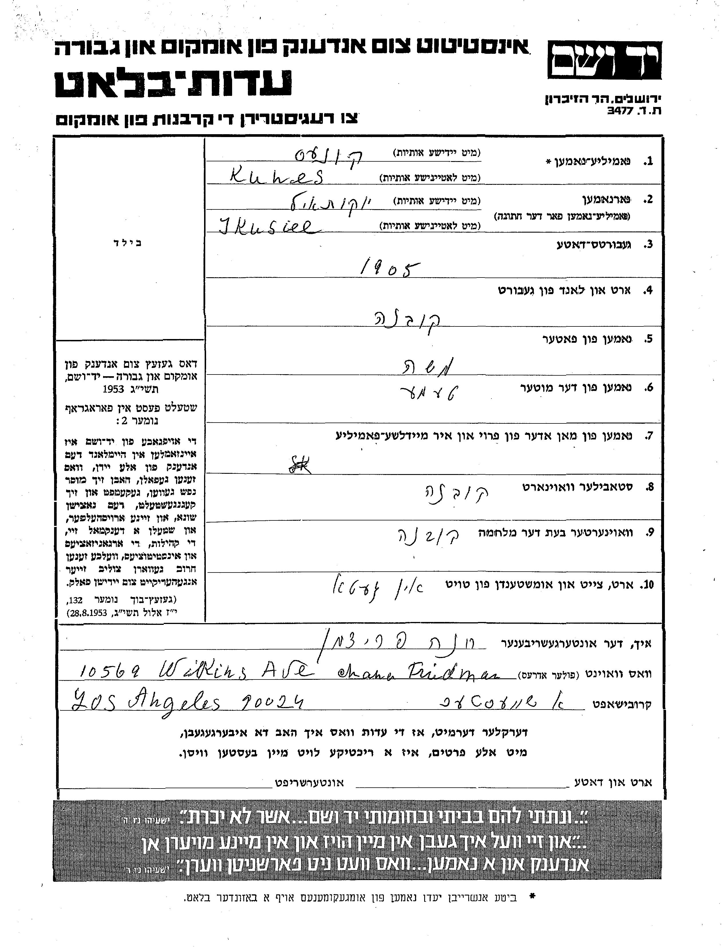 Kunes Ikusiel Iukutiel 1905 Kaunas, Lituanie Feuille de témoignage