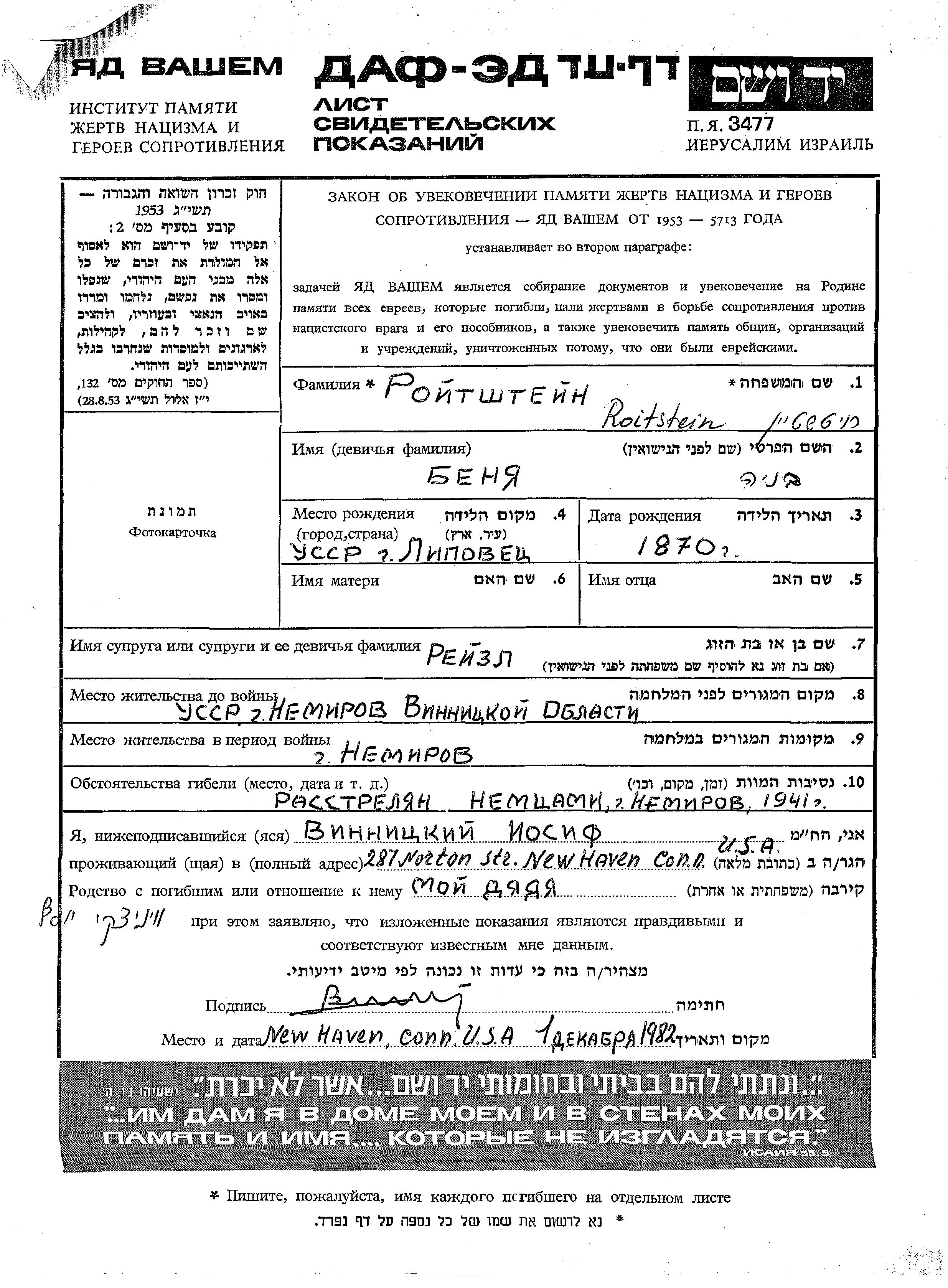 Roitstein Benia Benya 1870 Nemirov, Ukraine (URSS) Feuille de témoignage