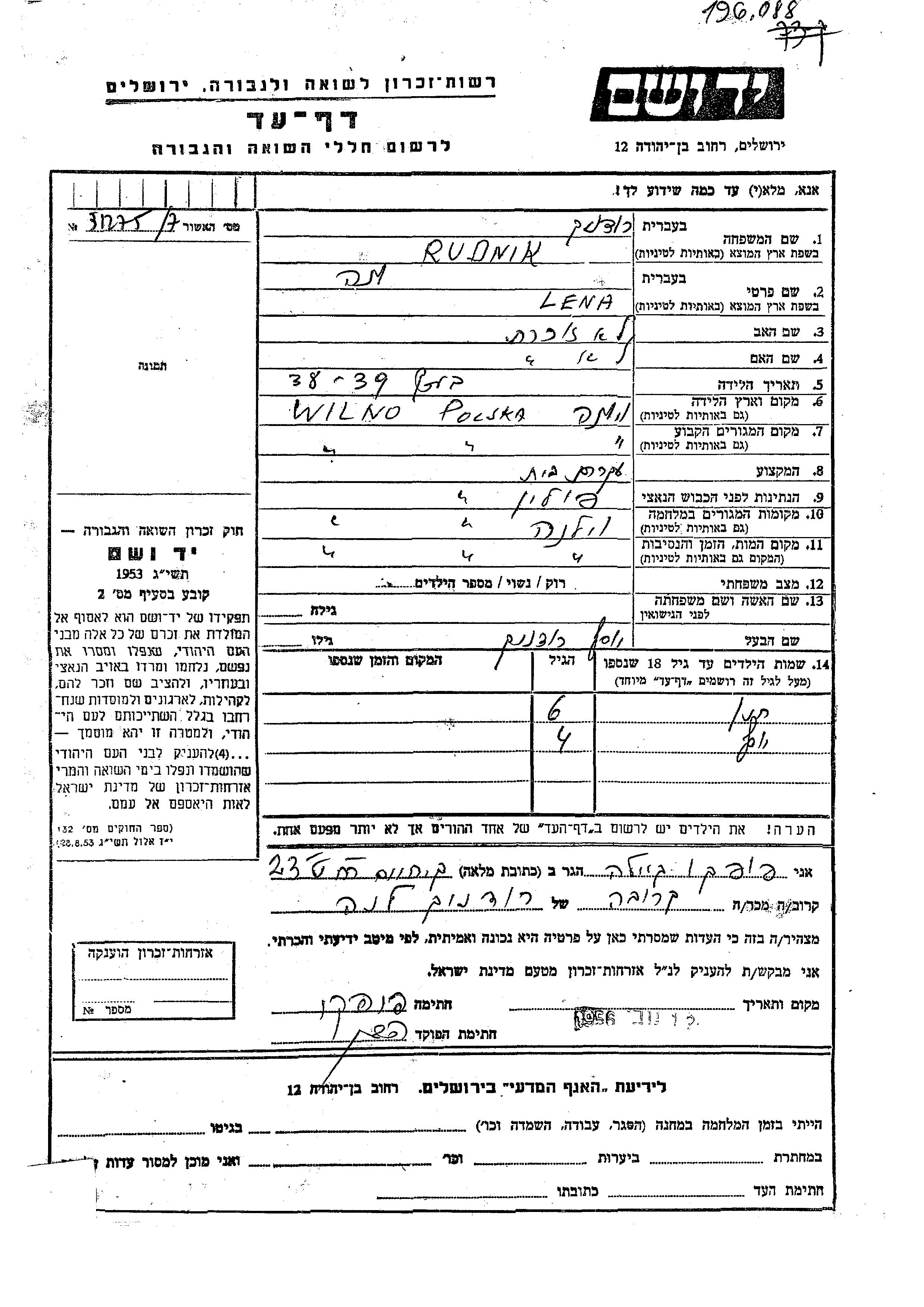 Lena Rudnik est née à Wilno, Pologne. Elle était Femme au foyer et Mariée à Yosef. Avant la seconde guerre mondiale elle vivait à Wilno, Pologne. Pendant la guerre, elle était à Wilno, Pologne.