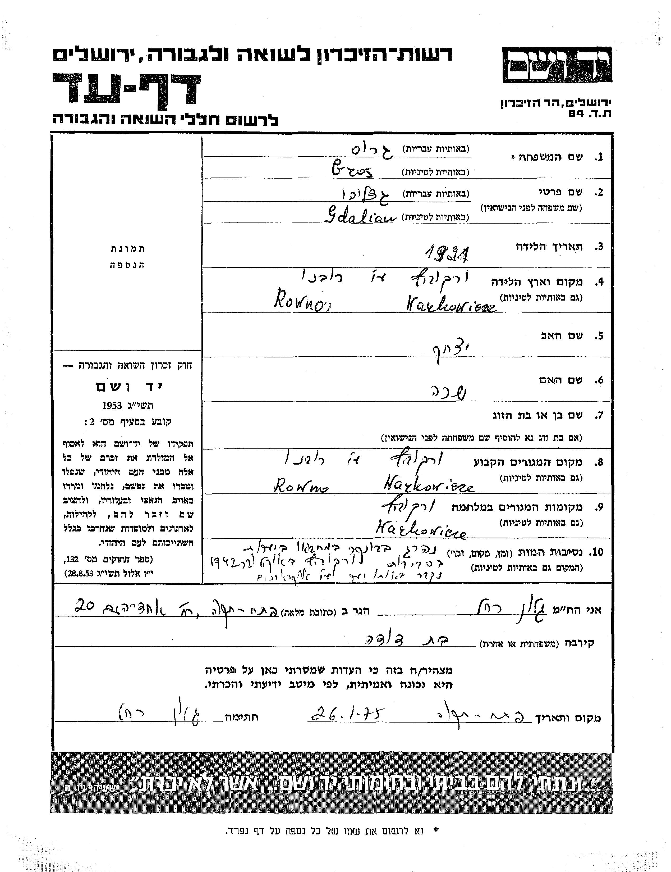 Gdaliau a été assassiné pendant la Shoah. Lieu de la mort: Warkowicze, Pologne en 10/1942.