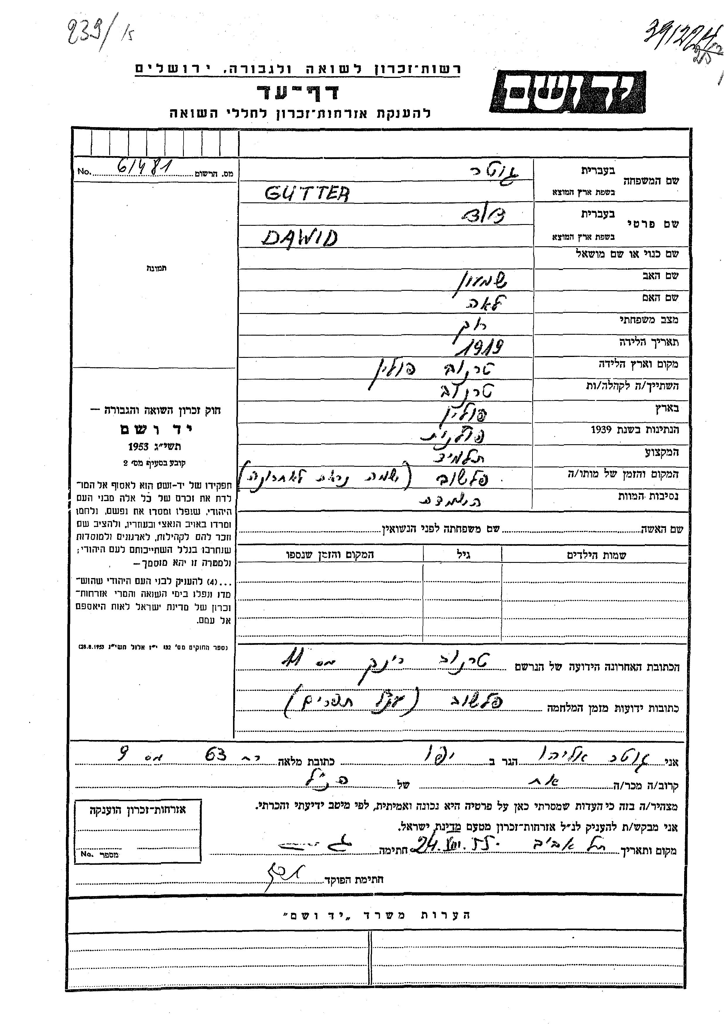 Dawid Gutter est né à Tarnow, Pologne en 1919, fils de Shimon et de Lea. Il était Élève. Avant la seconde guerre mondiale il vivait à Tarnow, Pologne. Au cours de la guerre, il était à Tarnow, Pologne.