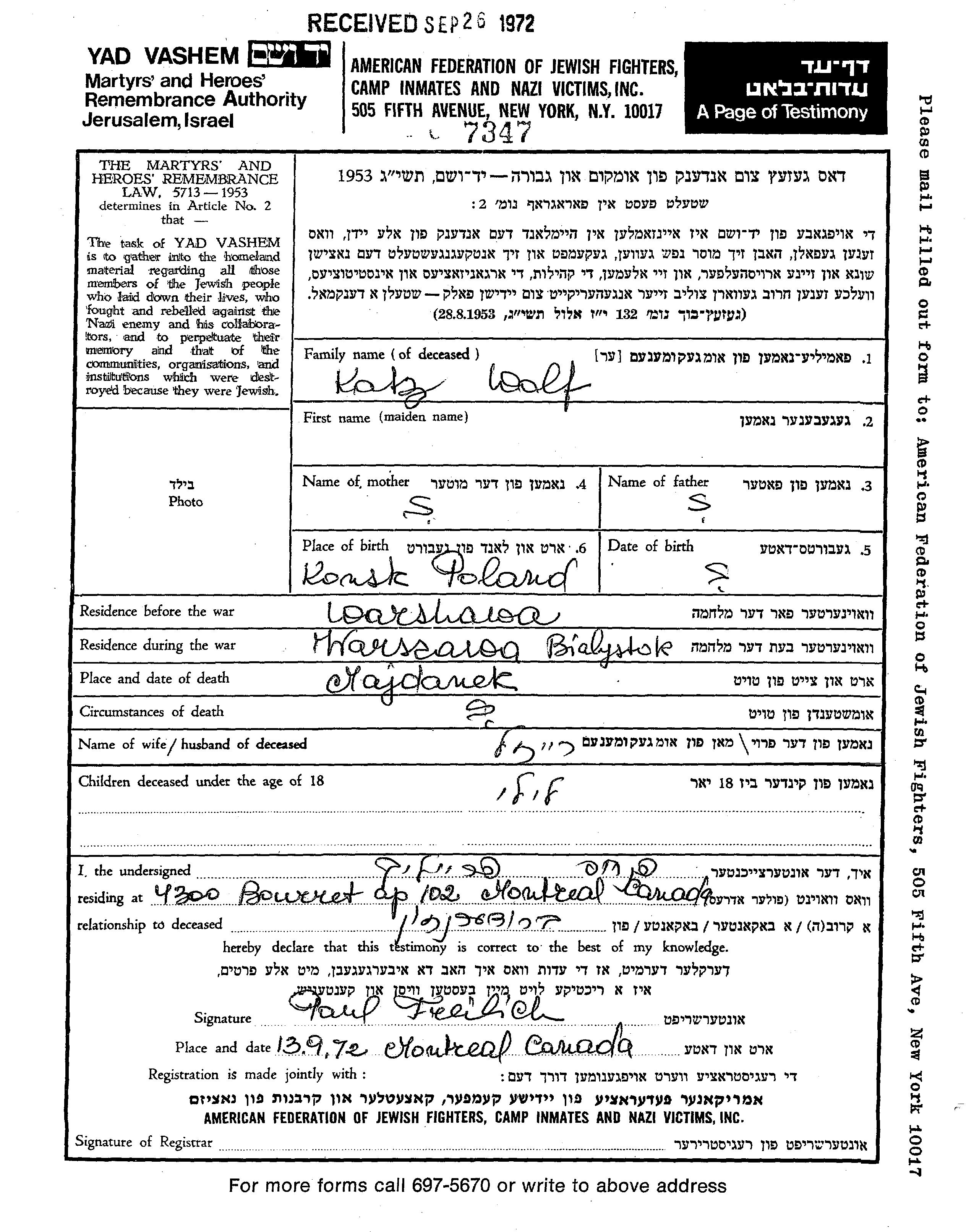 Katz Josef Warsaw, Pologne Feuille de témoignage
