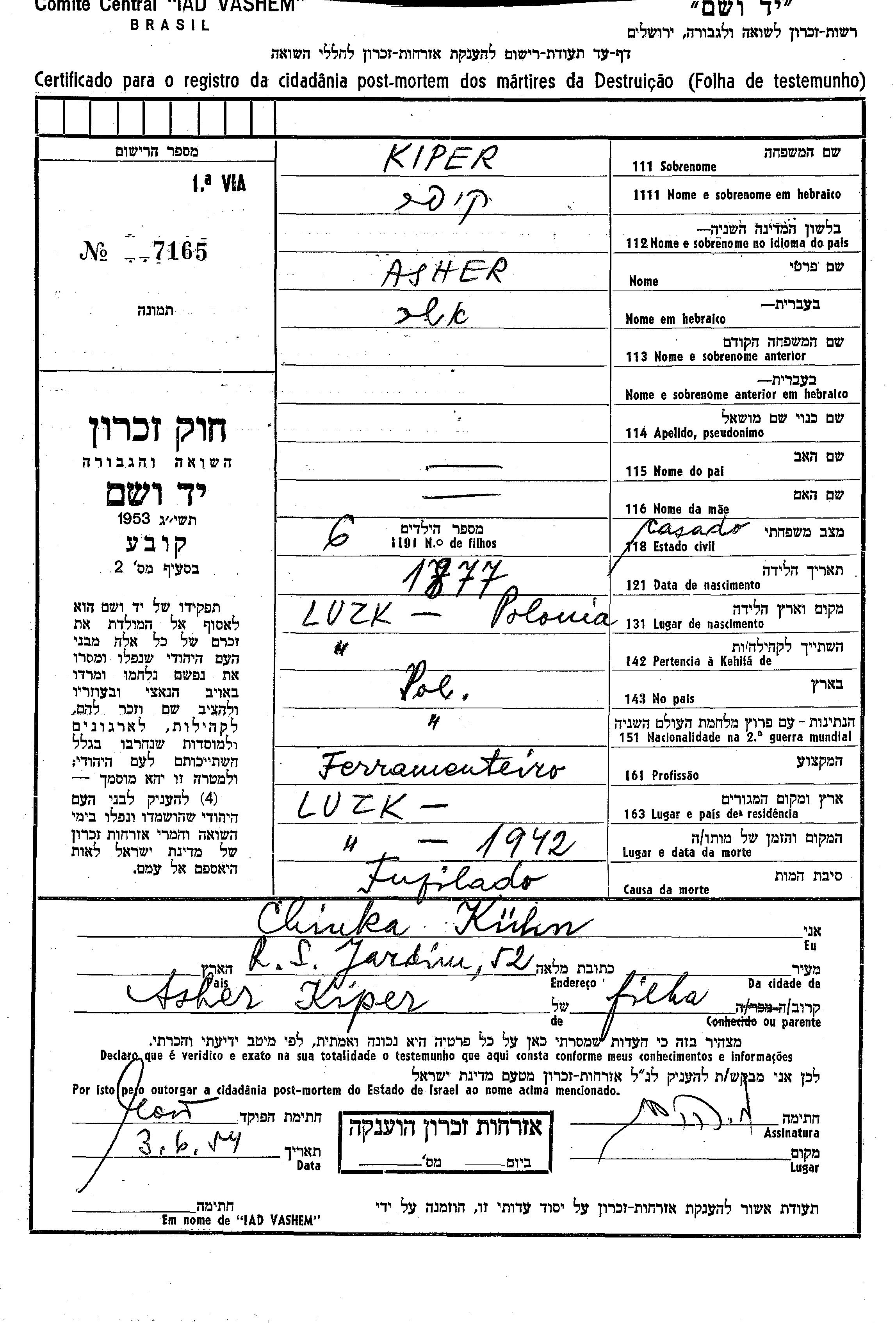Asher Kiper est né à Luzk, Pologne en 1877. Il était Ferblantier et Marié. Avant la seconde guerre mondiale il vivait à Luzk, Pologne. Au cours de la guerre, il était à Luzk, Pologne.