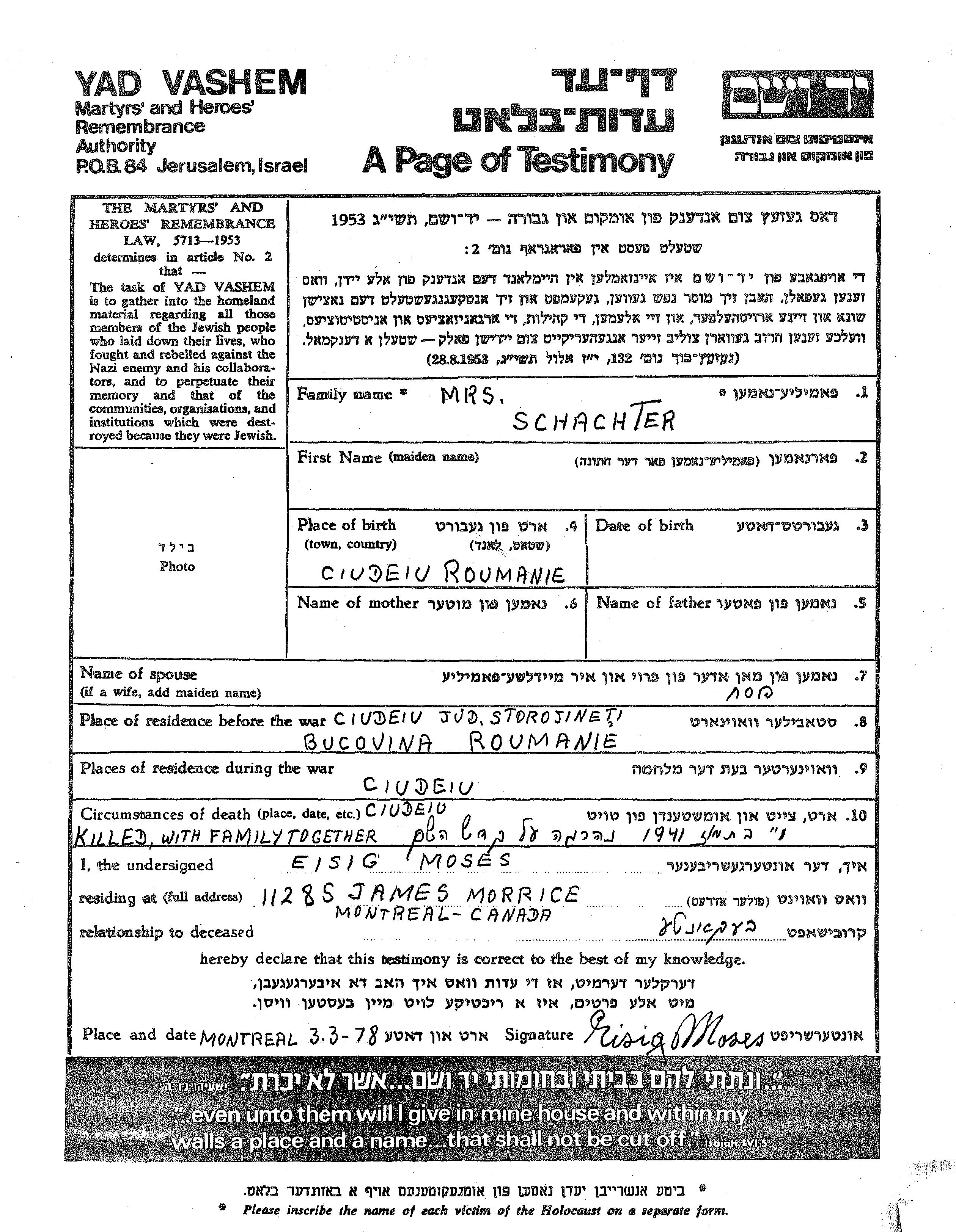 Schachter prénom inconnu Ciudeiu, Roumanie Feuille de témoignage
