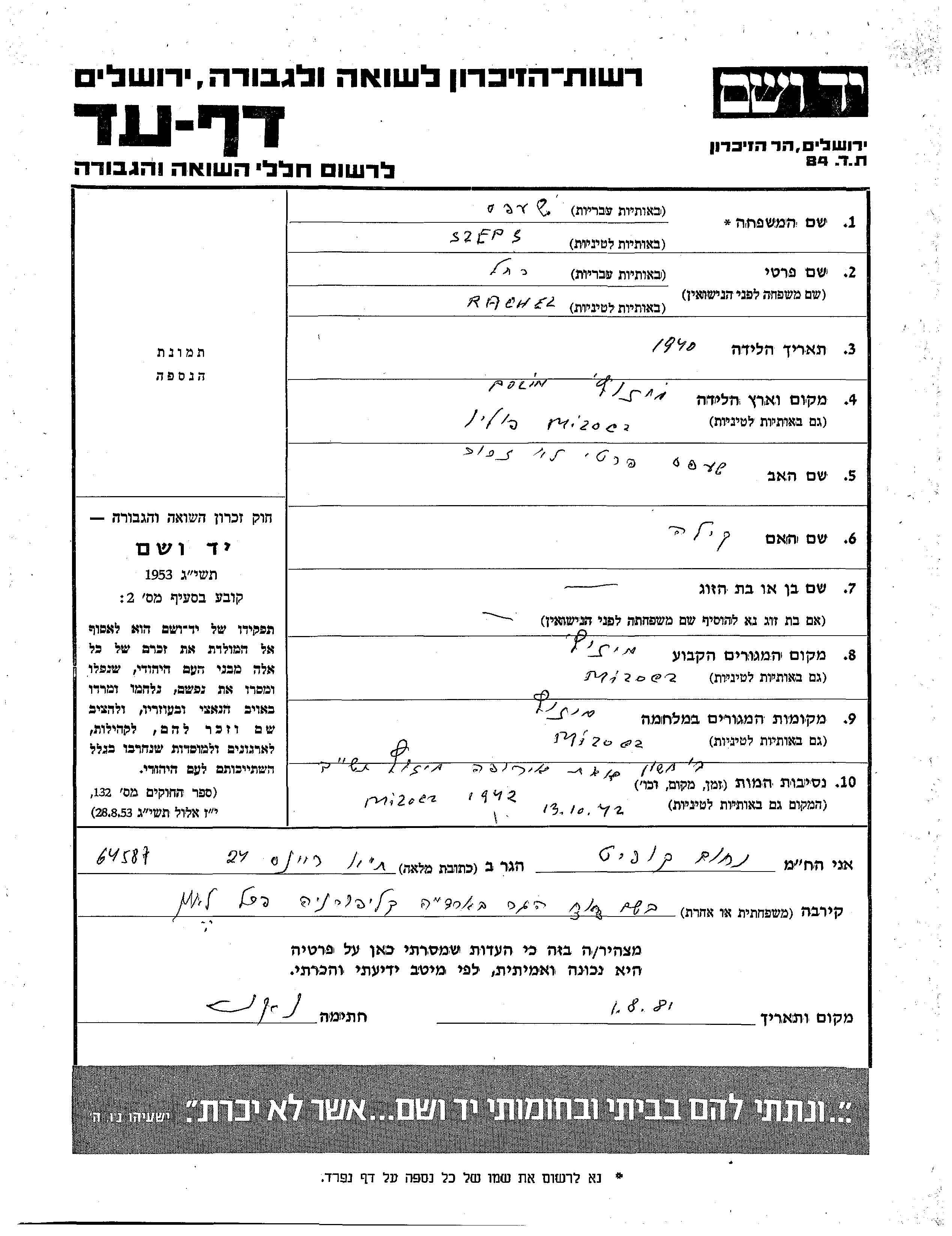 Szeps Rachel 1940 Mizocz, Pologne Feuille de témoignage