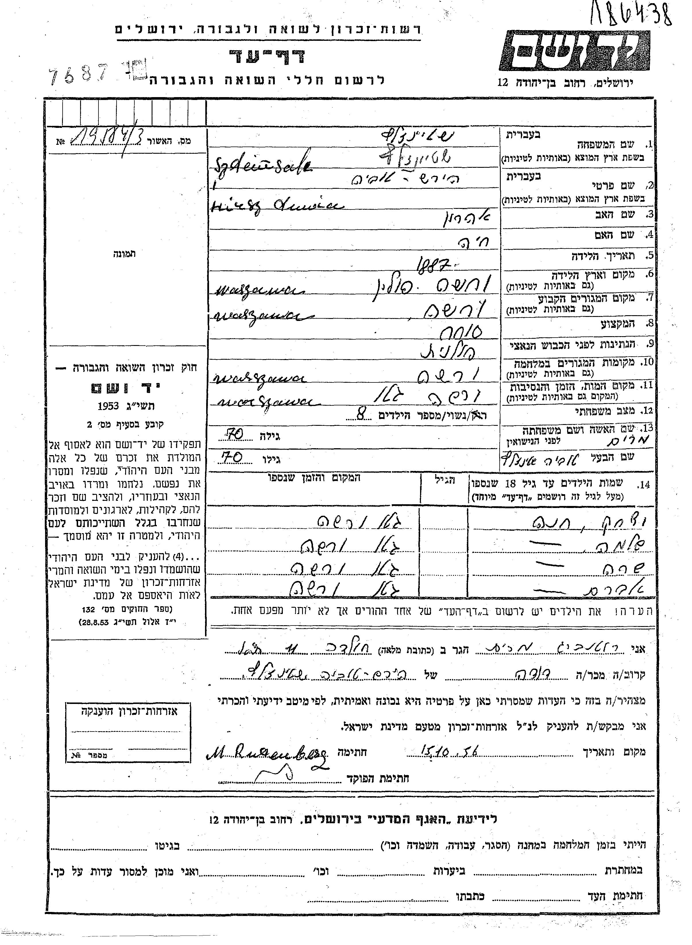 Szteinsalc Hirsz Tuwia 1887 Warszawa, Pologne Feuille de témoignage