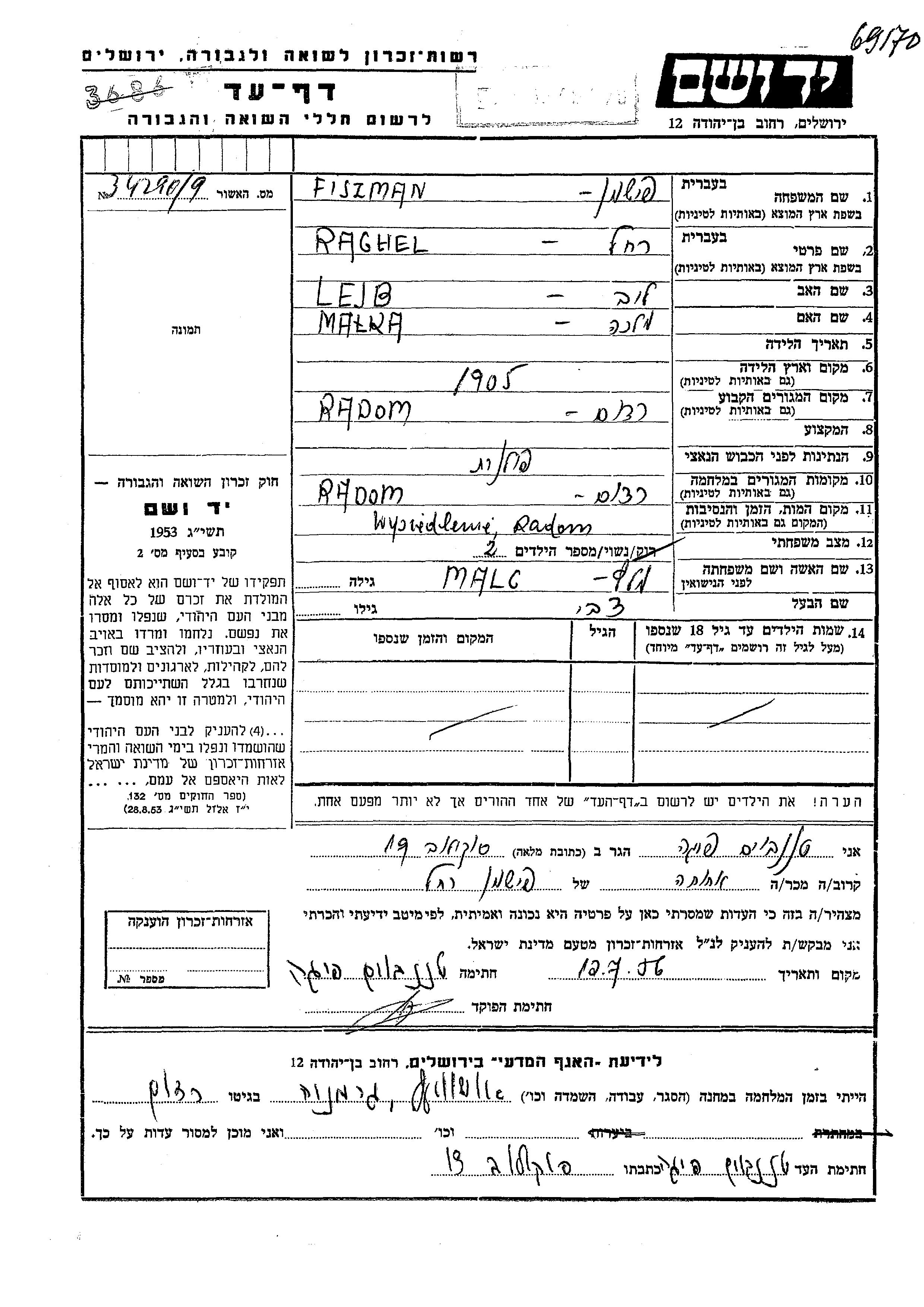 Rachel Fiszman née Malc est née en 1905, fille de Lejb et de Malka. Elle était Mariée à Tzvi. Avant la seconde guerre mondiale elle vivait à Radom, Pologne. Pendant la guerre, elle était à Radom, Pologne.