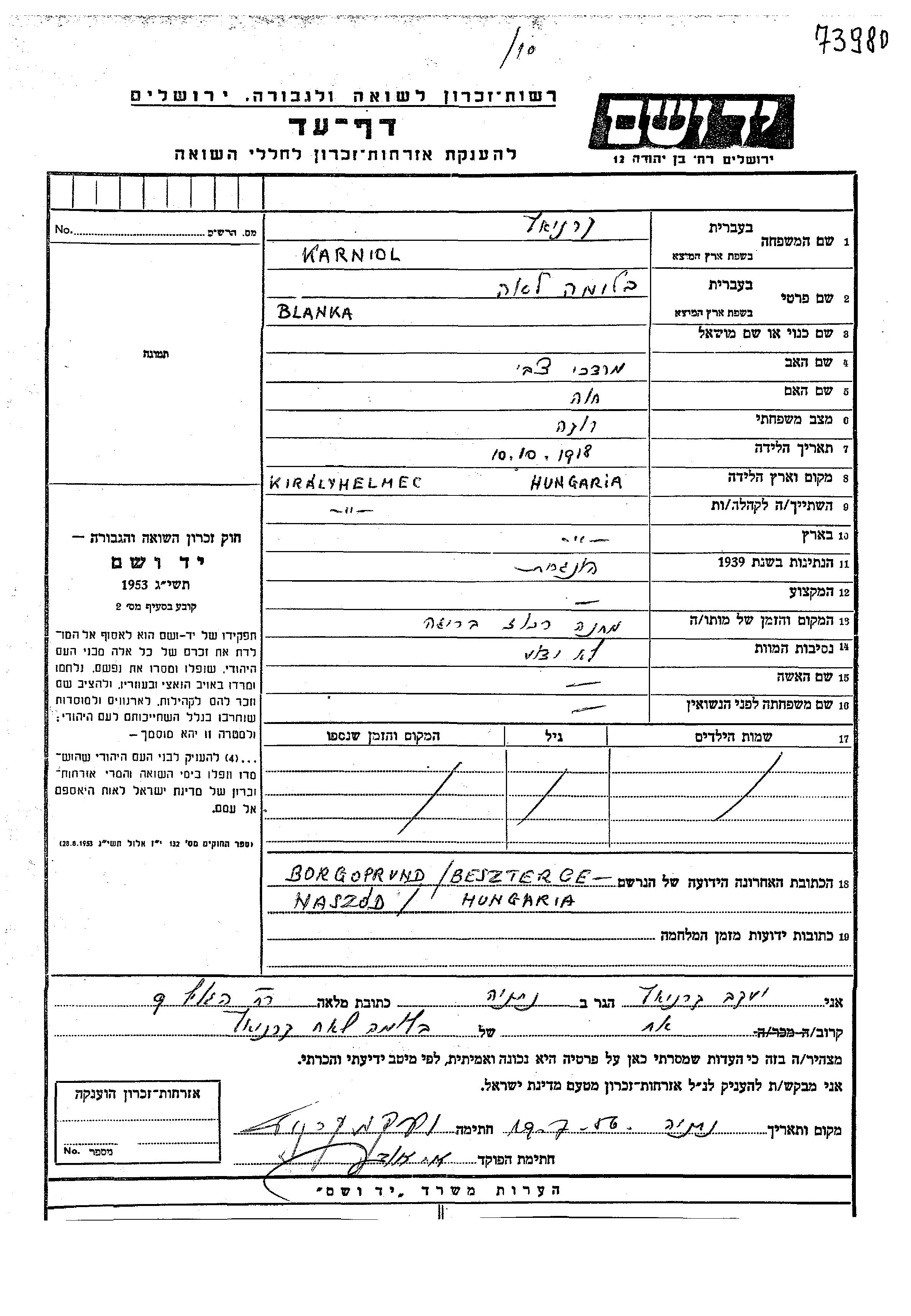 Karniol Karniel Blanka Bluma Lea 1918 Besztercenaszod, Roumanie Feuille de témoignage