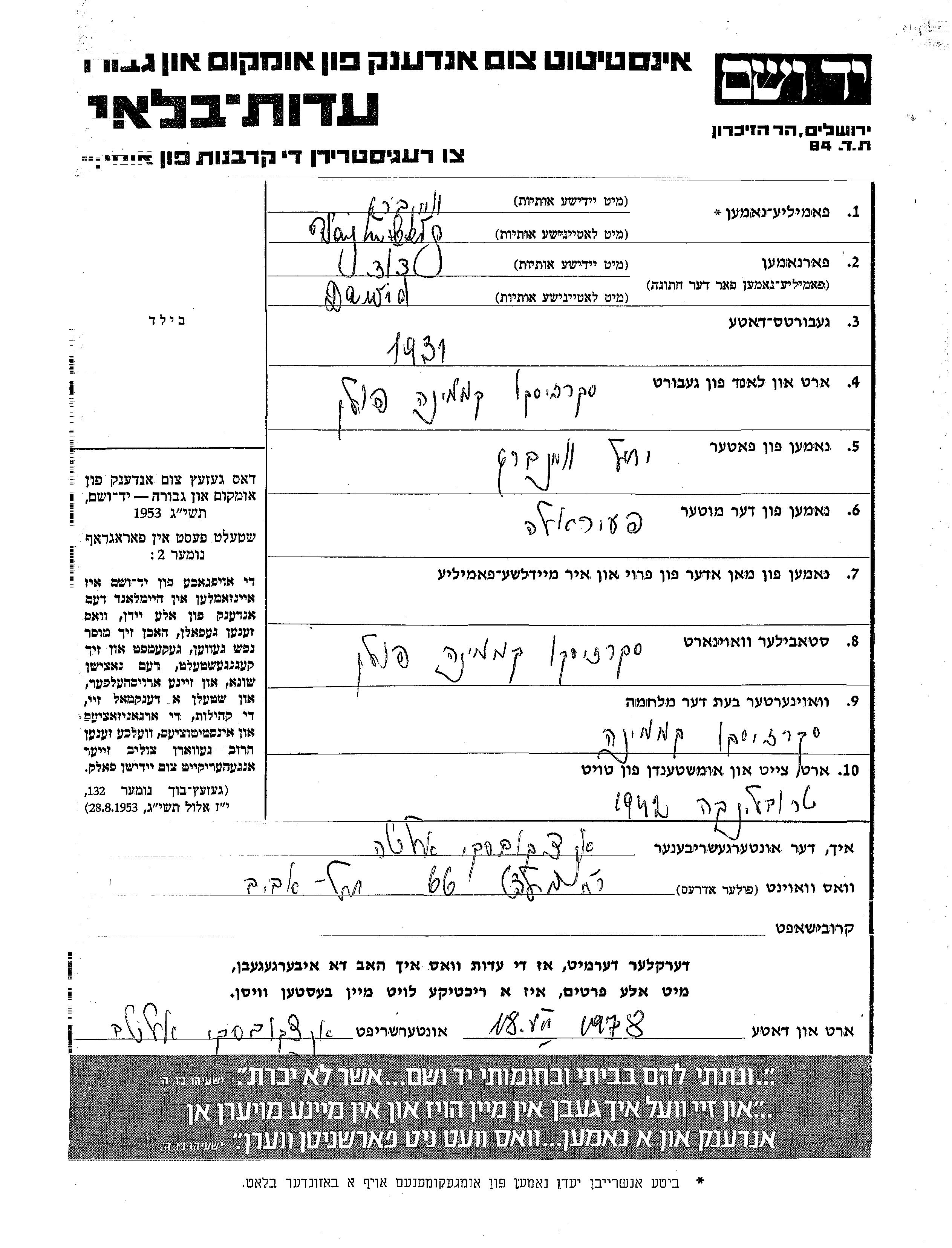Wajnberg Dawid 1931 Skarzysko Kamienna, Pologne Feuille de témoignage