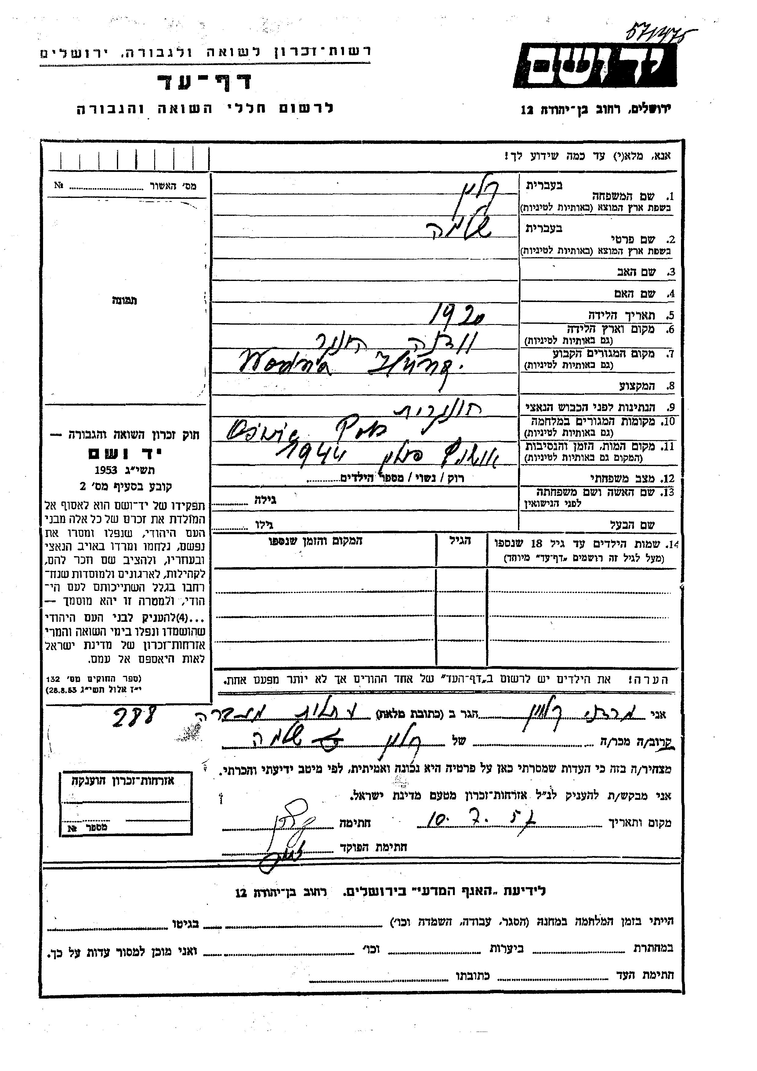 Kalin Shlomo 1920 Wodna, Feuille de témoignage