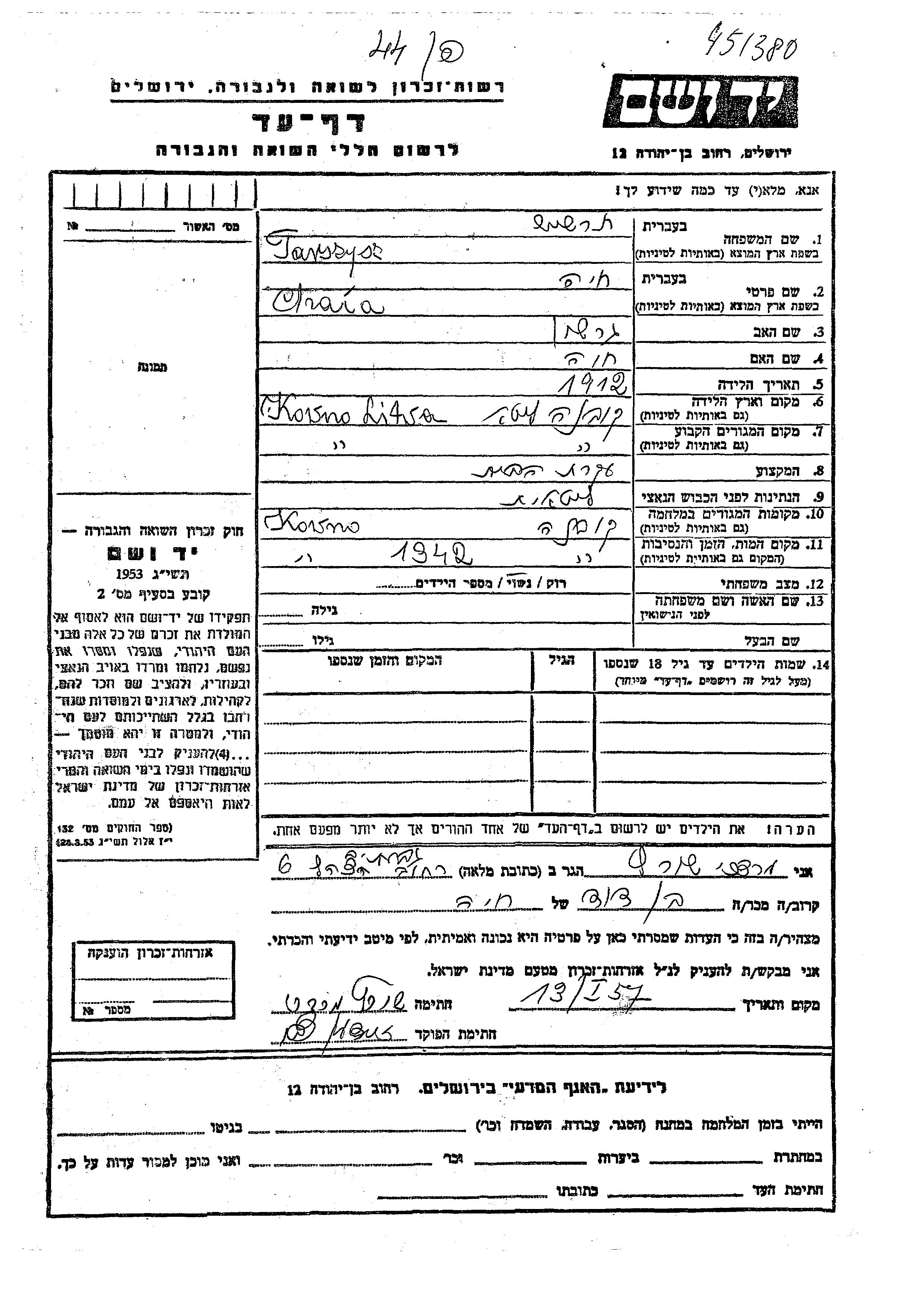 Yad Vashem - Pages of Testimony Names Memorial Collection