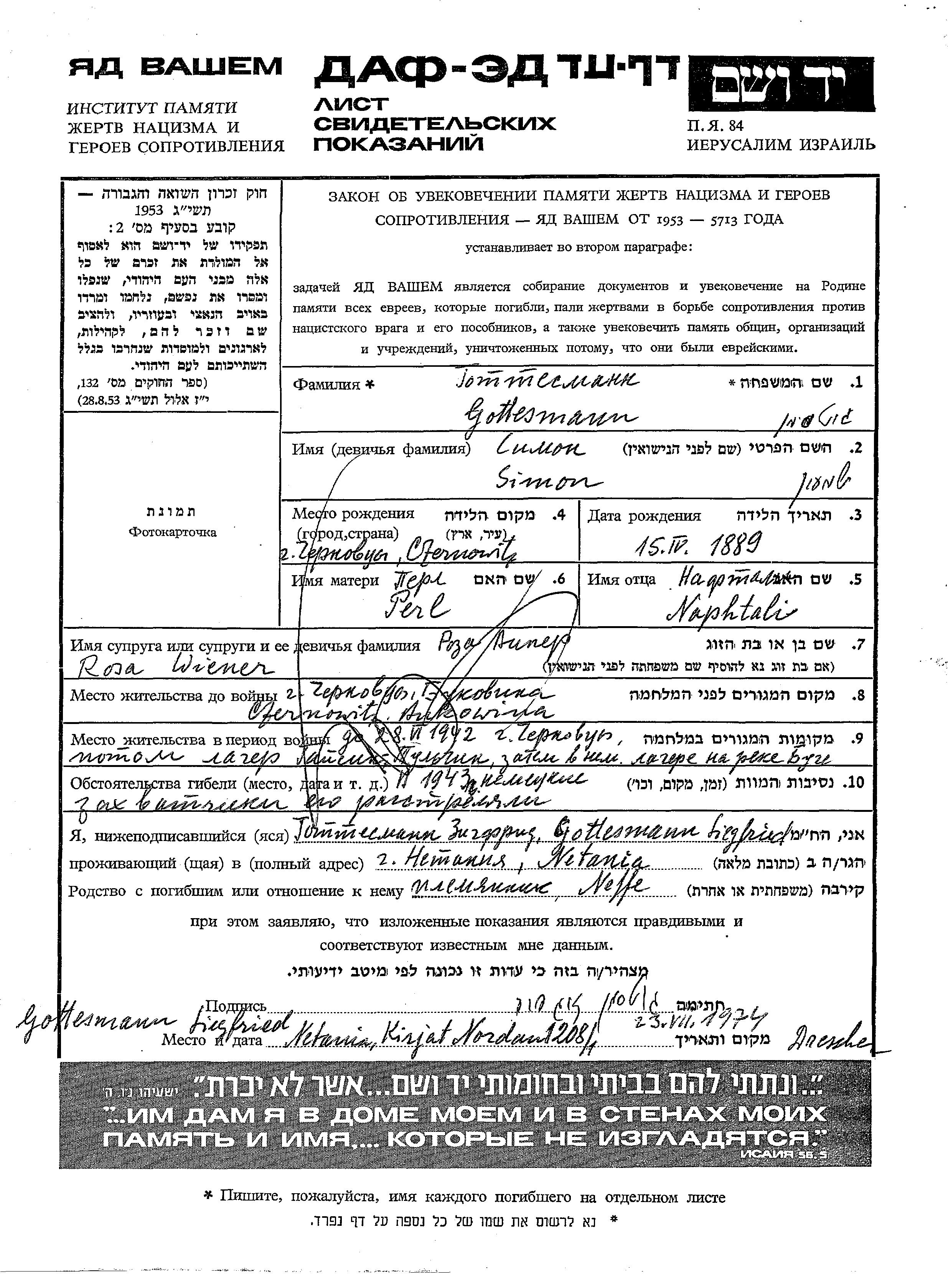 Gottesmann Simon 1889 Czernowitz, Roumanie Feuille de témoignage