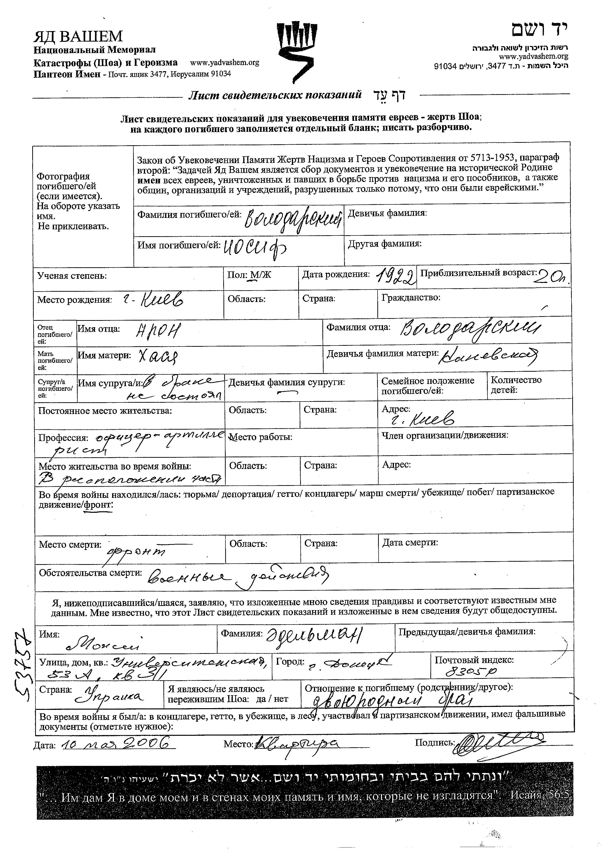 Volodarski Iosif 1922 Kiev, Ukraine (URSS) Feuille de témoignage