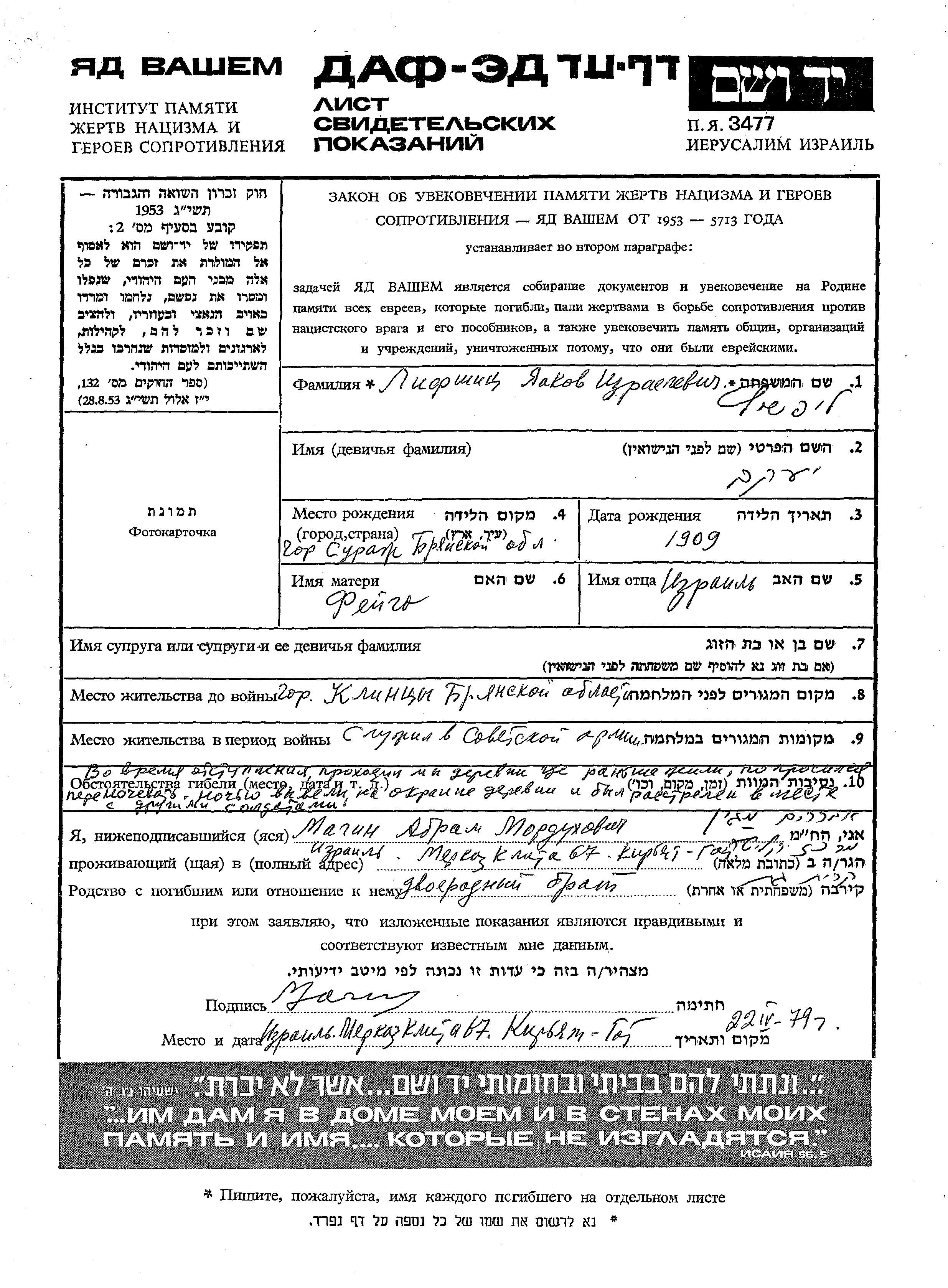 Livshitz Yakov 1909 Klintzy, Russie (URSS) Feuille de témoignage