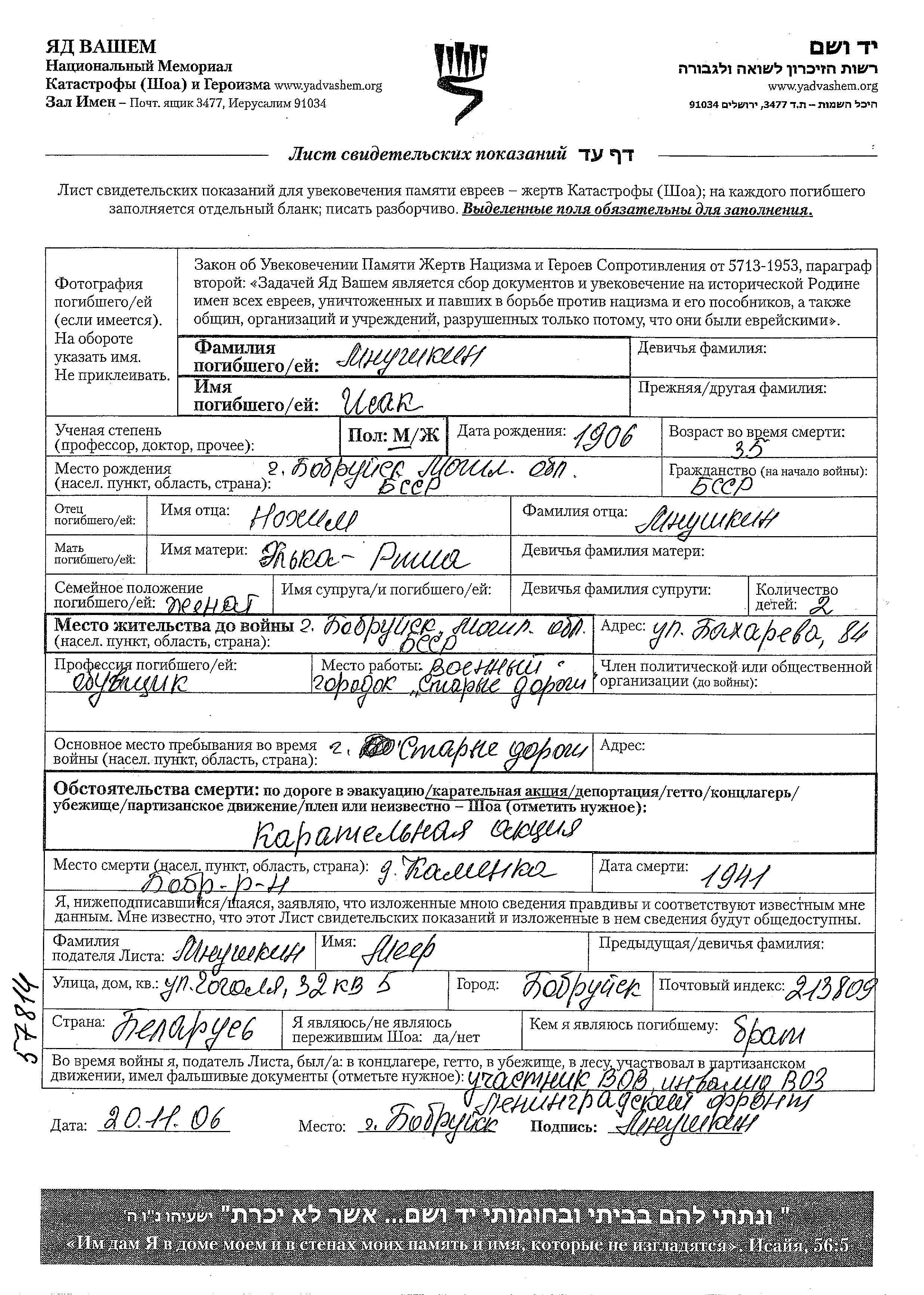 Mnushkin Isak 1906 Bobruysk, Bélorussie (URSS) Feuille de témoignage