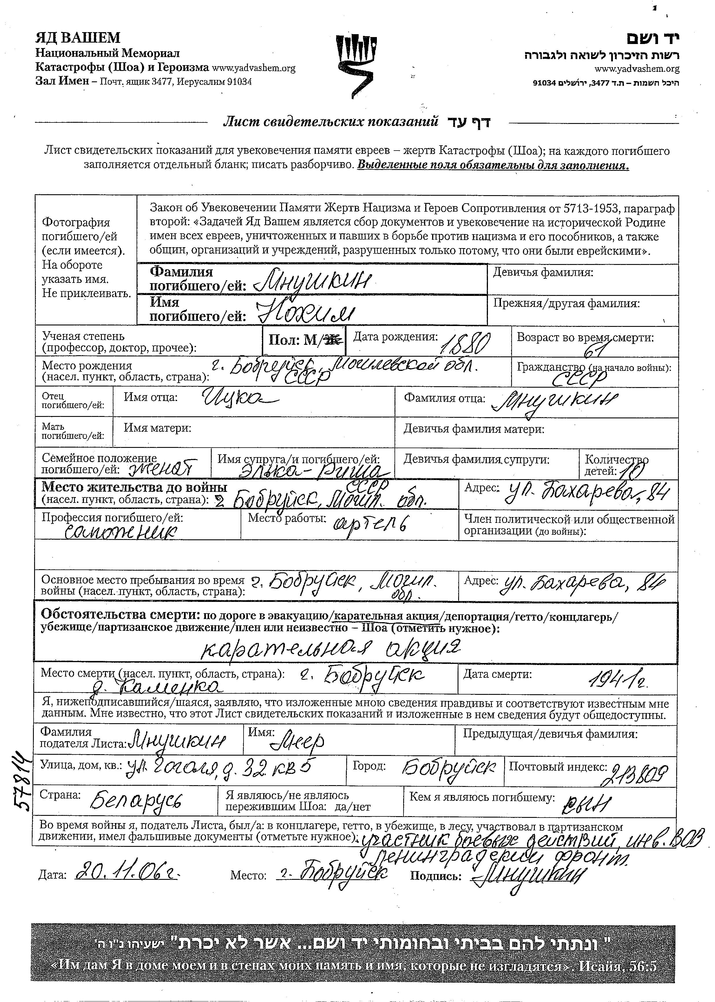 Nokhim Mnushkin est né à Bobruysk, Bélorussie (URSS) en 1880, fils de Itzka. Il était Cordonnier et Mariée à Risha Elka. Avant la seconde guerre mondiale il vivait à Bobruysk, Bélorussie (URSS). Au cours de la guerre, il était à Bobruysk, Bélorussie (URSS).