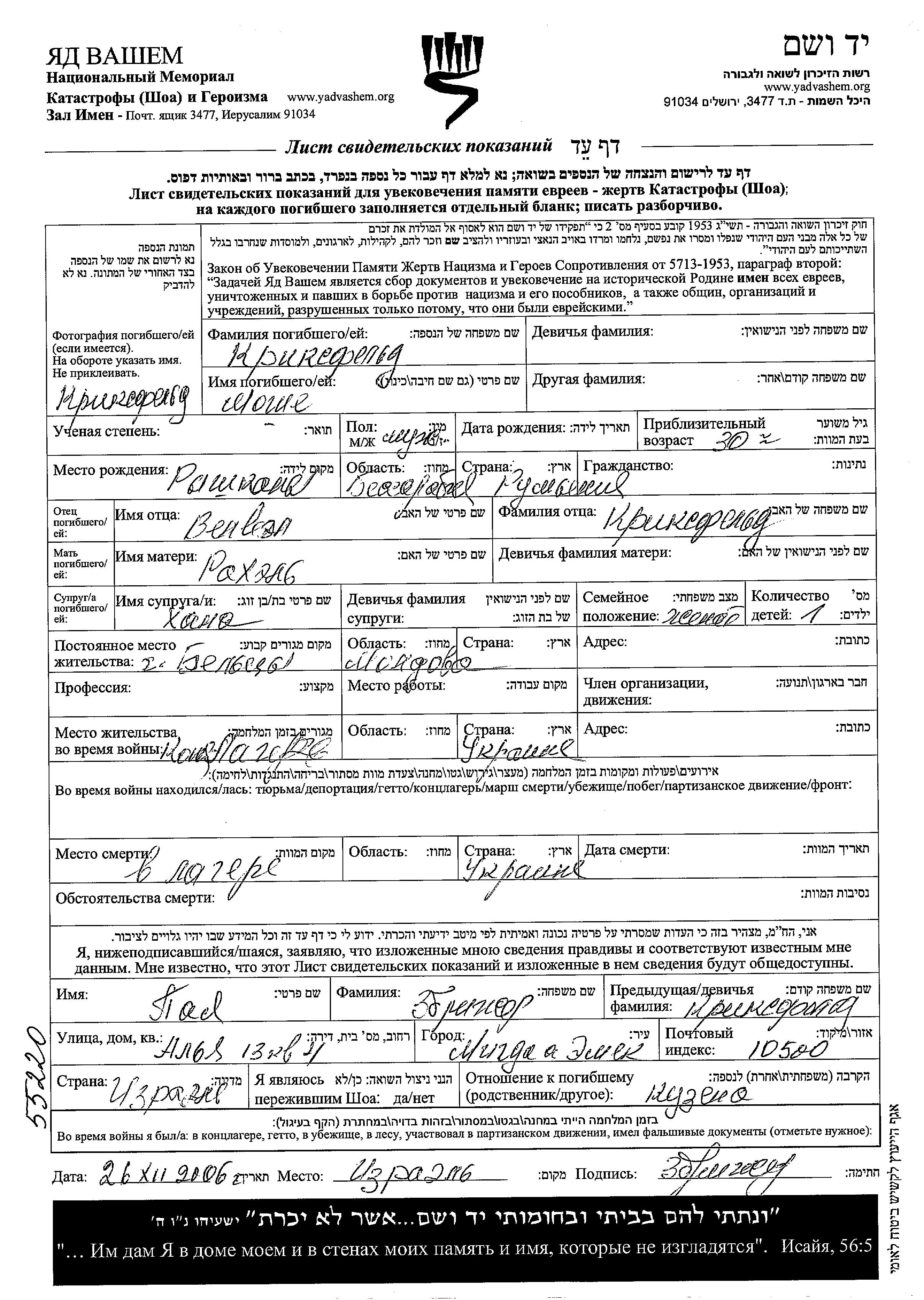 Kriksfeld Moshe Beltsy, Roumanie Feuille de témoignage