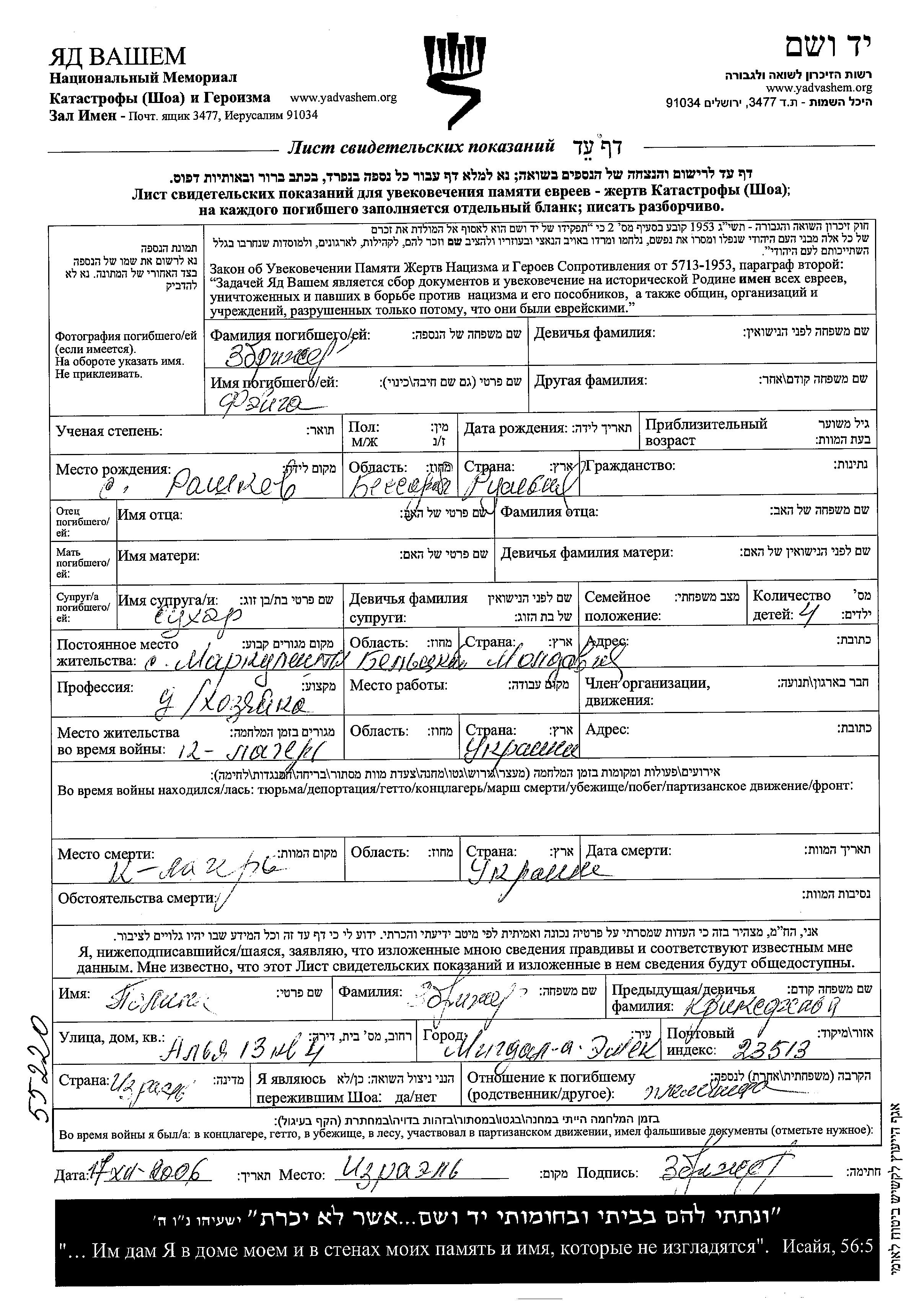 Zbrizher Feiga Mărculești, Roumanie Feuille de témoignage